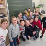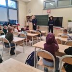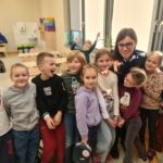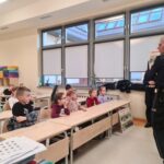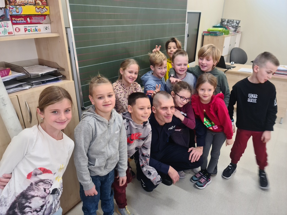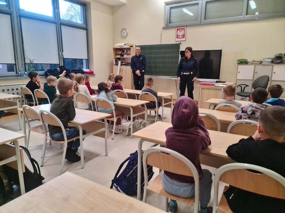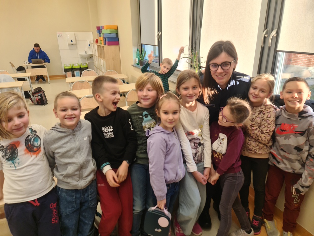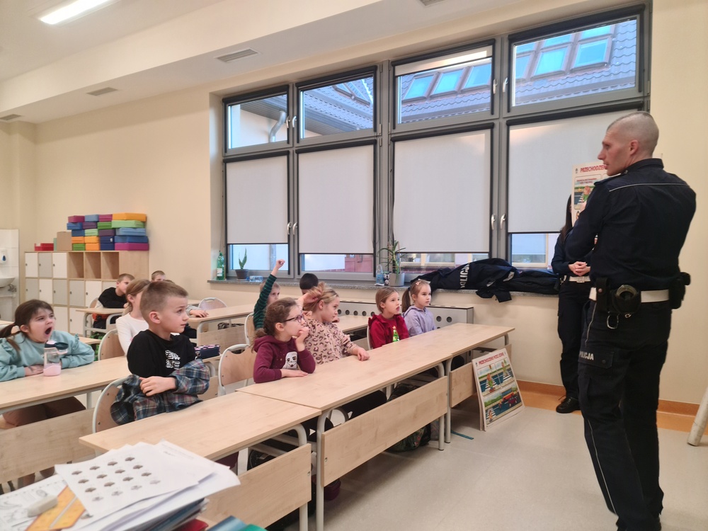 27 listopada uczniowie klasy 1d uczestniczyli w spotkaniu z funkcjonariuszami policji. Dzieci miały okazję porozmawiać z Policjantami o zachowaniu bezpieczeństwa w drodze do i ze szkoły, o bezpiecznym przechodzeniu przez ulicę oraz prawidłowym zachowaniu się na przejściach dla pieszych, przypominane były numery alarmowe i sposoby wzywania pomocy. Funkcjonariusze poruszali także tematykę właściwego zachowania w szkole i w domu oraz zagrożeń wynikających z kontaktów z nieznajomymi. Uczniowie czynnie uczestniczyli w spotkaniu, dzieląc się swoimi spostrzeżeniami i doświadczeniami oraz zadając dużo pytań.