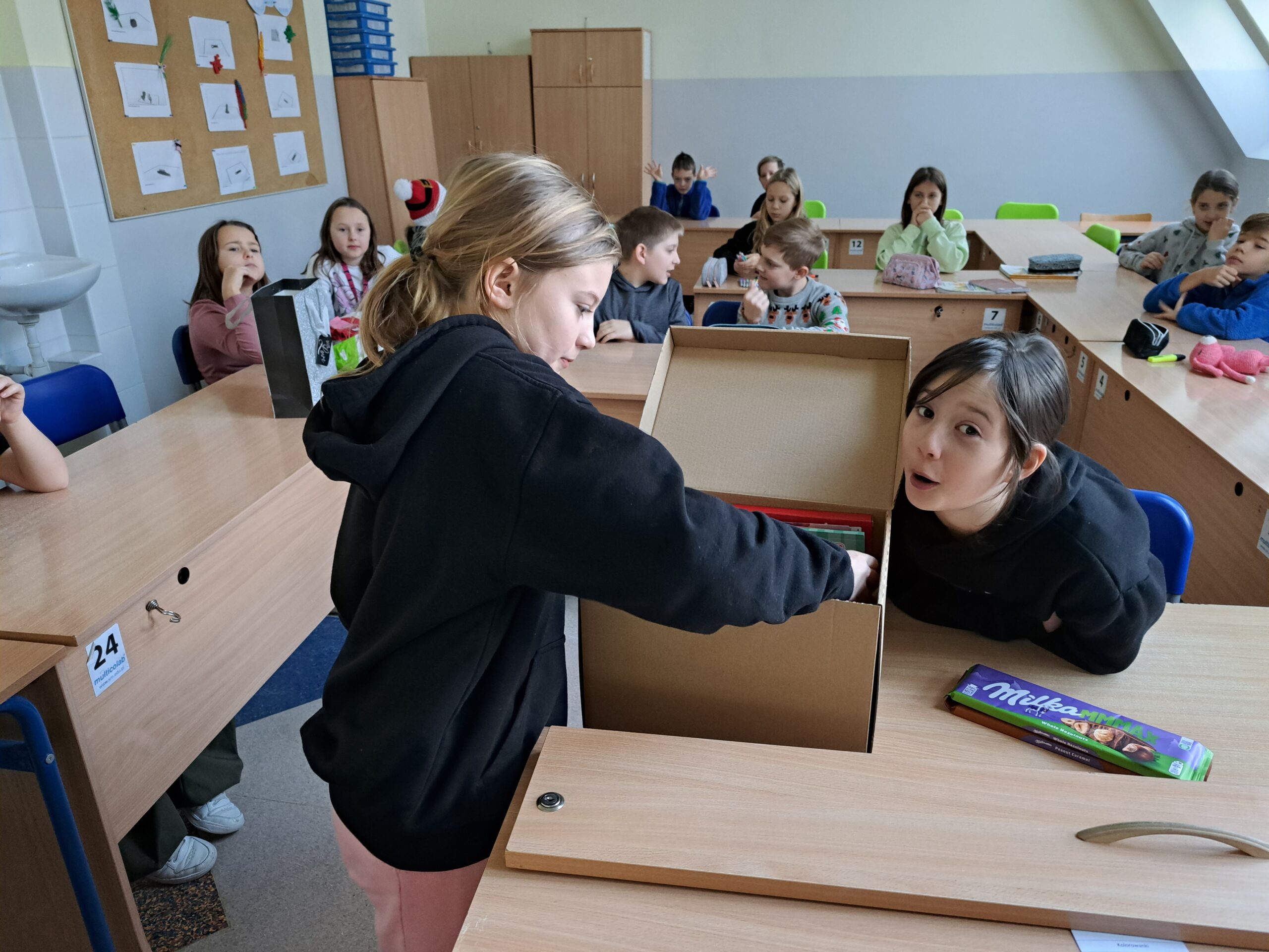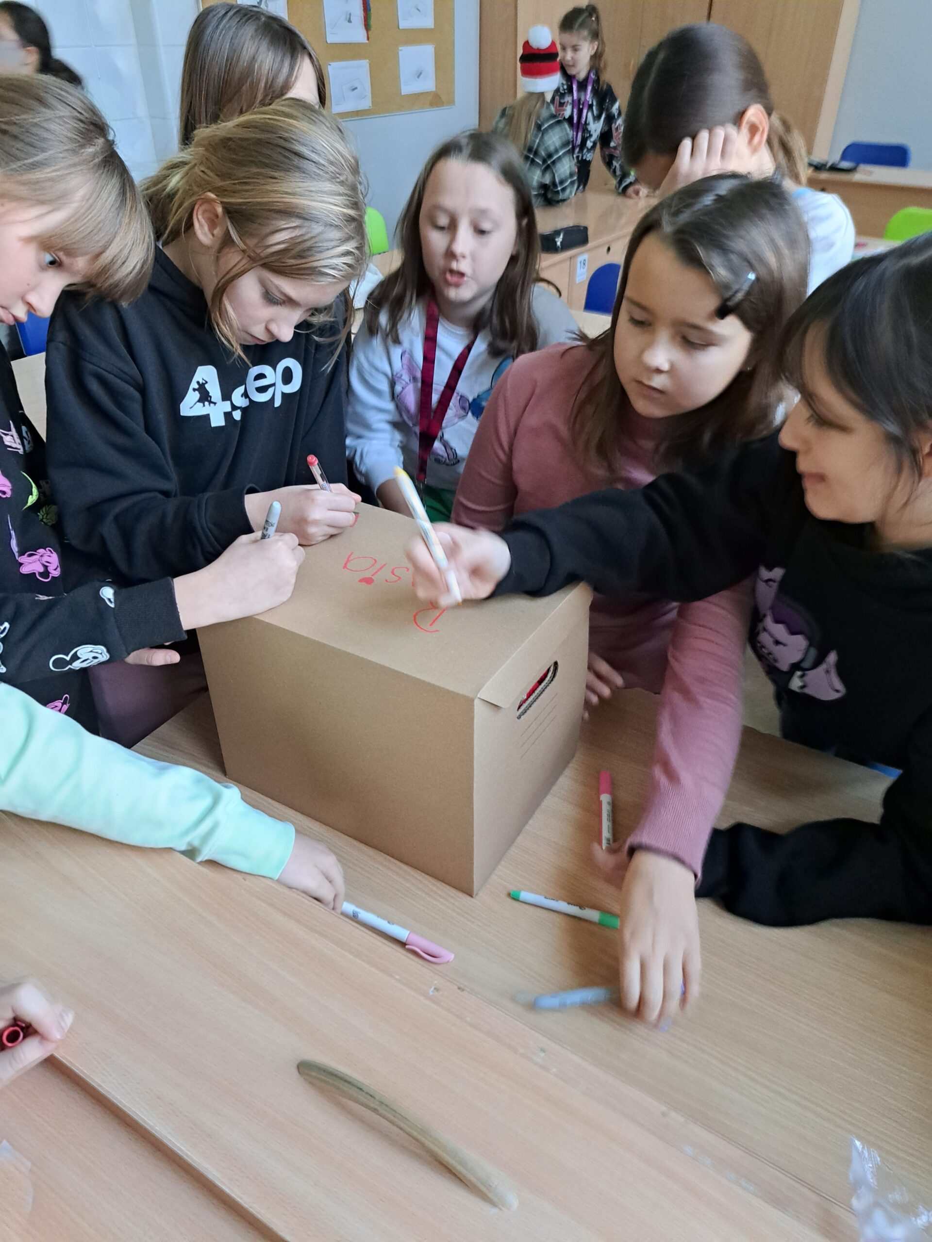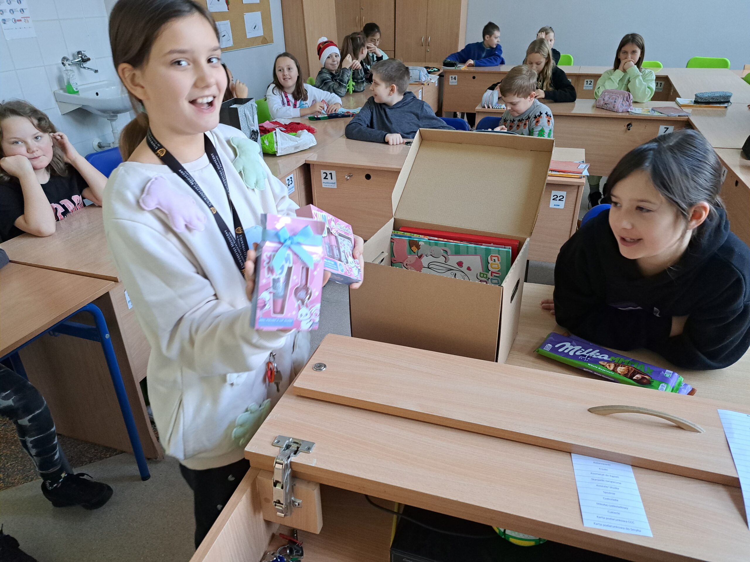 W poniedziałek 4.12 uczniowie z klasy 4b przygotowali paczki dla Basi i Miłosza – dzieci z naszej gminy, znajdujących się w trudnym położeniu materialnym. Spakowane paczki ozdobili rysunkami i podpisami w rytm świątecznych przebojów. Uczniowie cieszyli się, że mogli komuś sprawić radość podarkami, a jednocześnie uświadomili sobie jak wiele sami posiadają. Mamy nadzieje, że ta piękna inicjatywa w przyszłym roku będzie jeszcze większa! Ogromnie dziękujemy również rodzicom z klasy 4b za zakup prezentów.