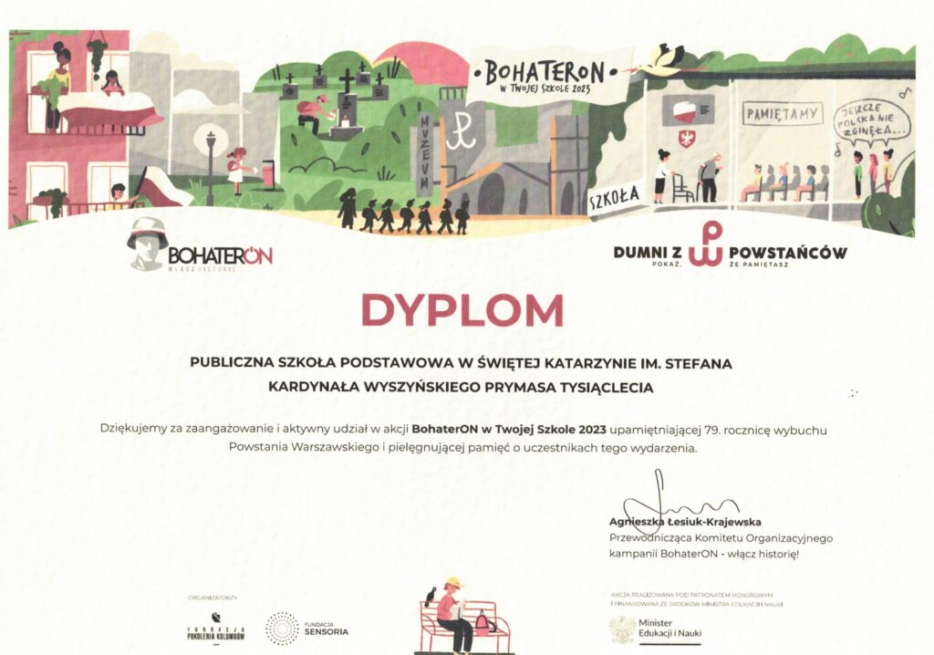 5 stycznia, 2024 Dyplom za udział w akcji Otrzymaliśmy dyplom za udział w akcji BohaterON w Twojej Szkole 2023
