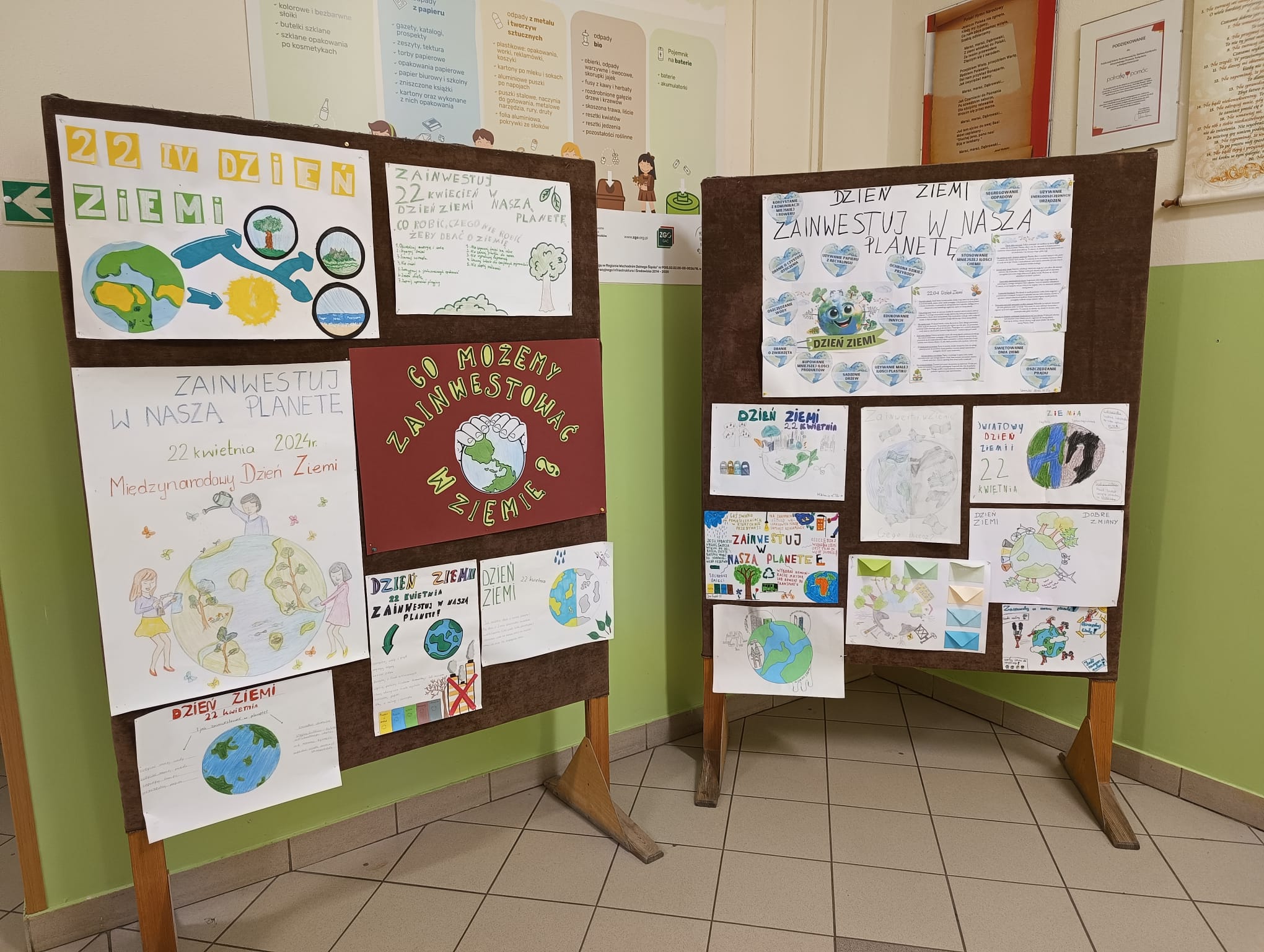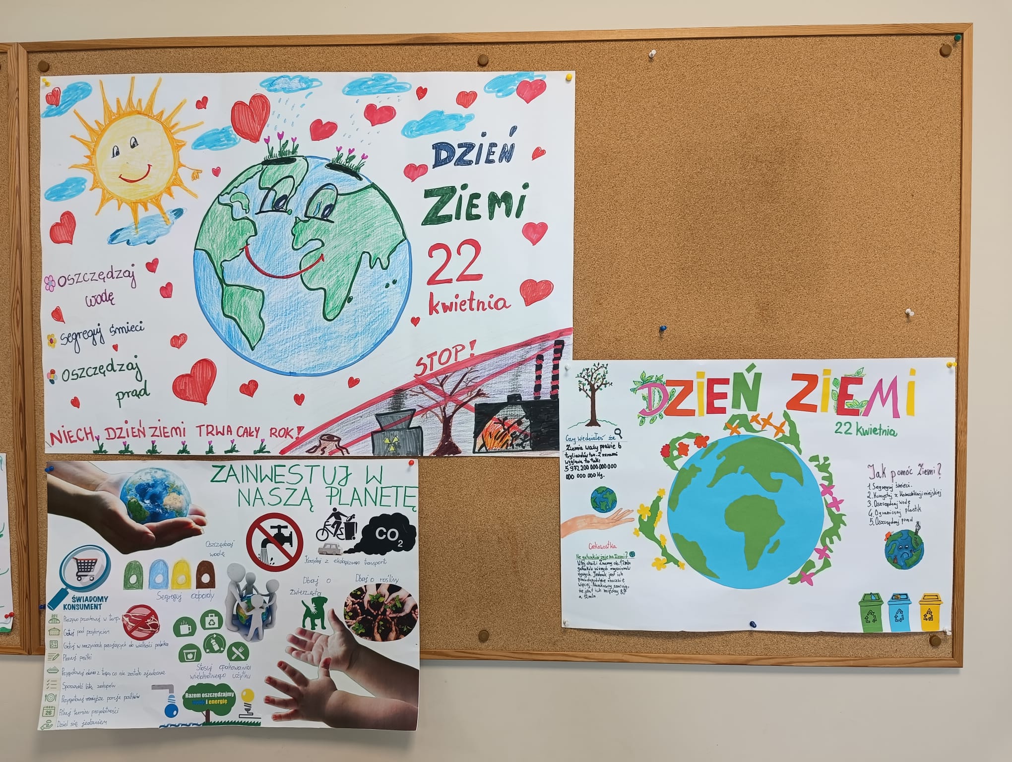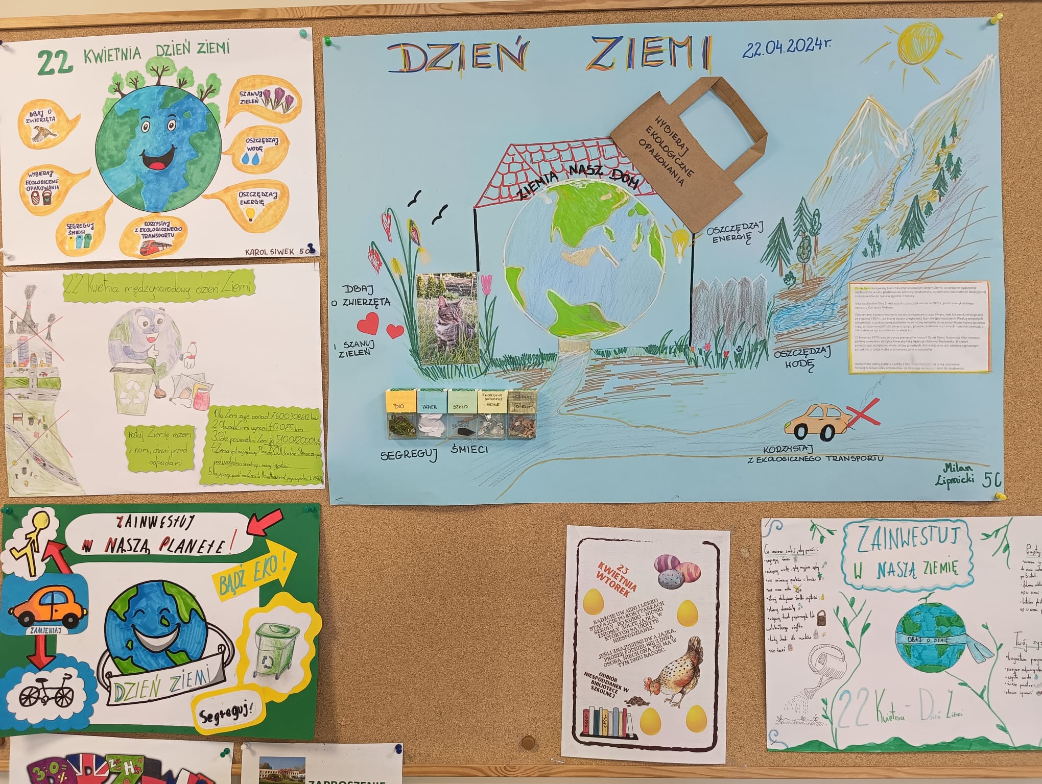 22 kwietnia obchodziliśmy w naszej szkole Światowy Dzień Ziemi. Uczniowie ubrani w barwy naszego globu (niebieski, zielony i brązowy) brali udział w różnych aktywnościach na rzecz błękitnej planety. Pomimo niskich temperatur, zarówno starsi uczniowie jak i młodsi, licznie sprzątali miejsca zabaw i wypoczynku w Świętej Katarzynie. Było też sadzenie drzewek wokół szkoły i cebulek kwiatowych w klasach. Uszkodzone budki dla owadów odzyskały dawny wygląd. W klasach powstawały lapbooki, a na korytarzach zawisły plakaty o tematyce ekologicznej. Kolejne obchody Dnia Ziemi za rok, ale o naszej planecie i konieczności dbania o jej przyrodę pamiętamy codziennie!