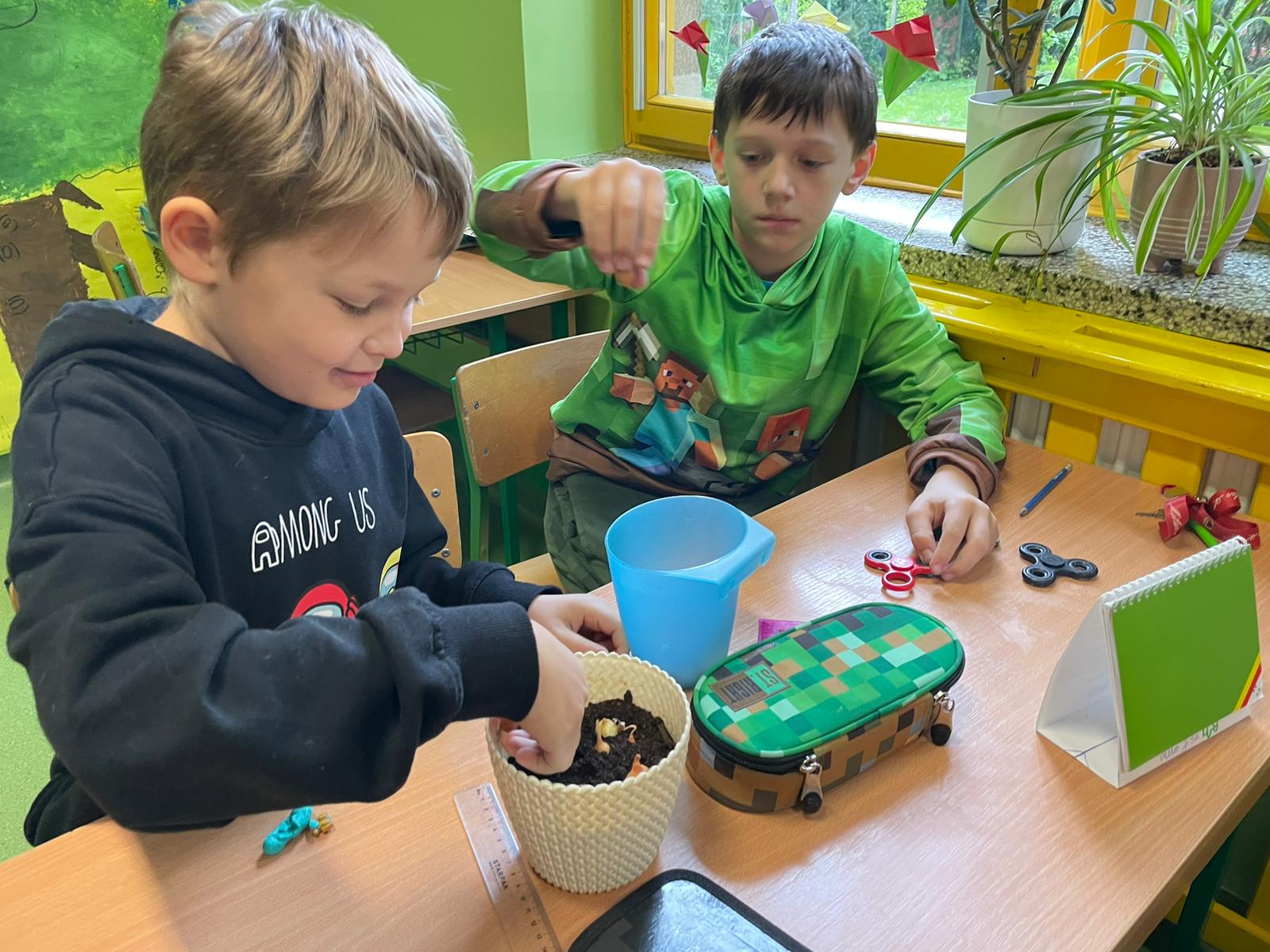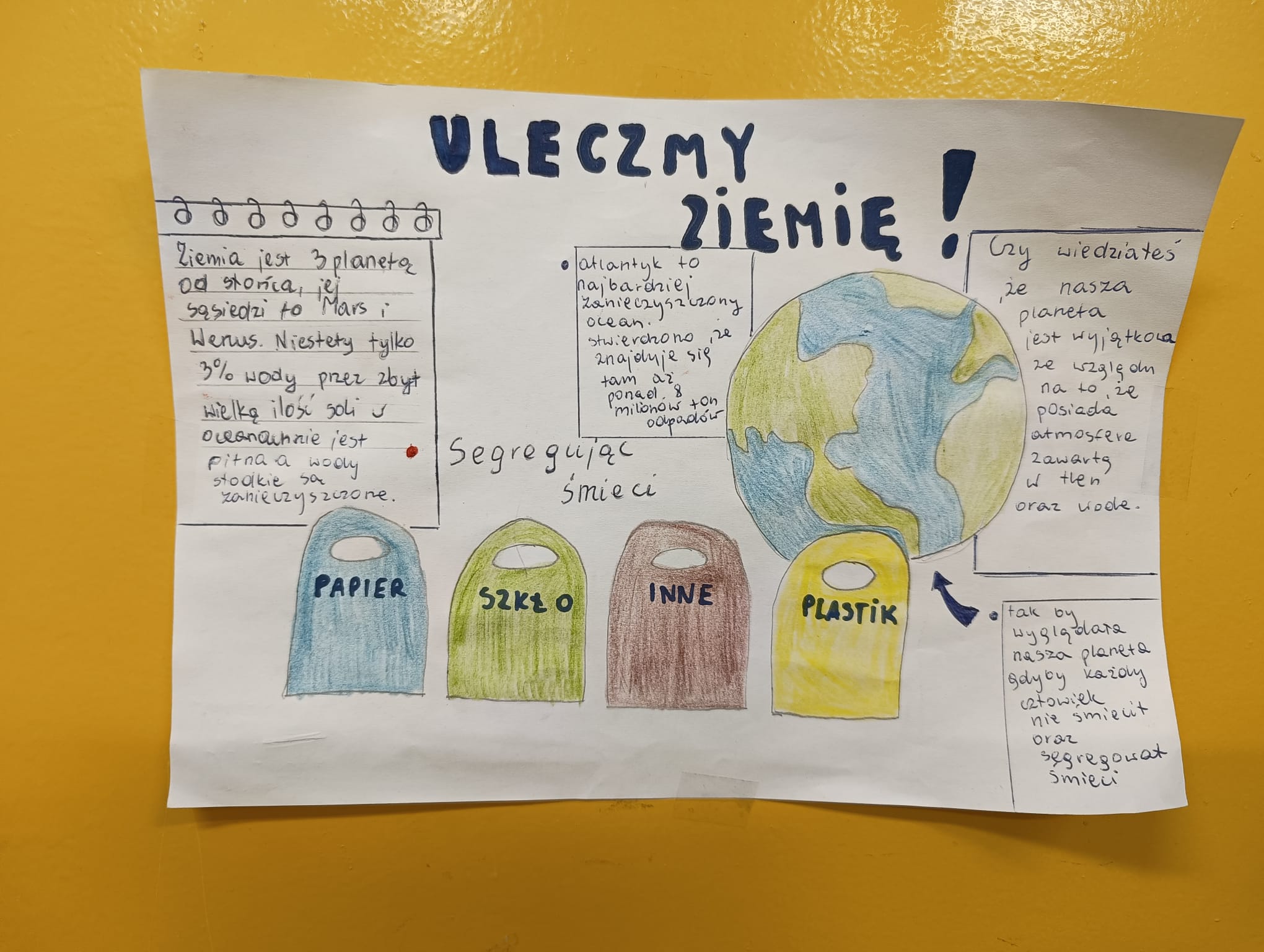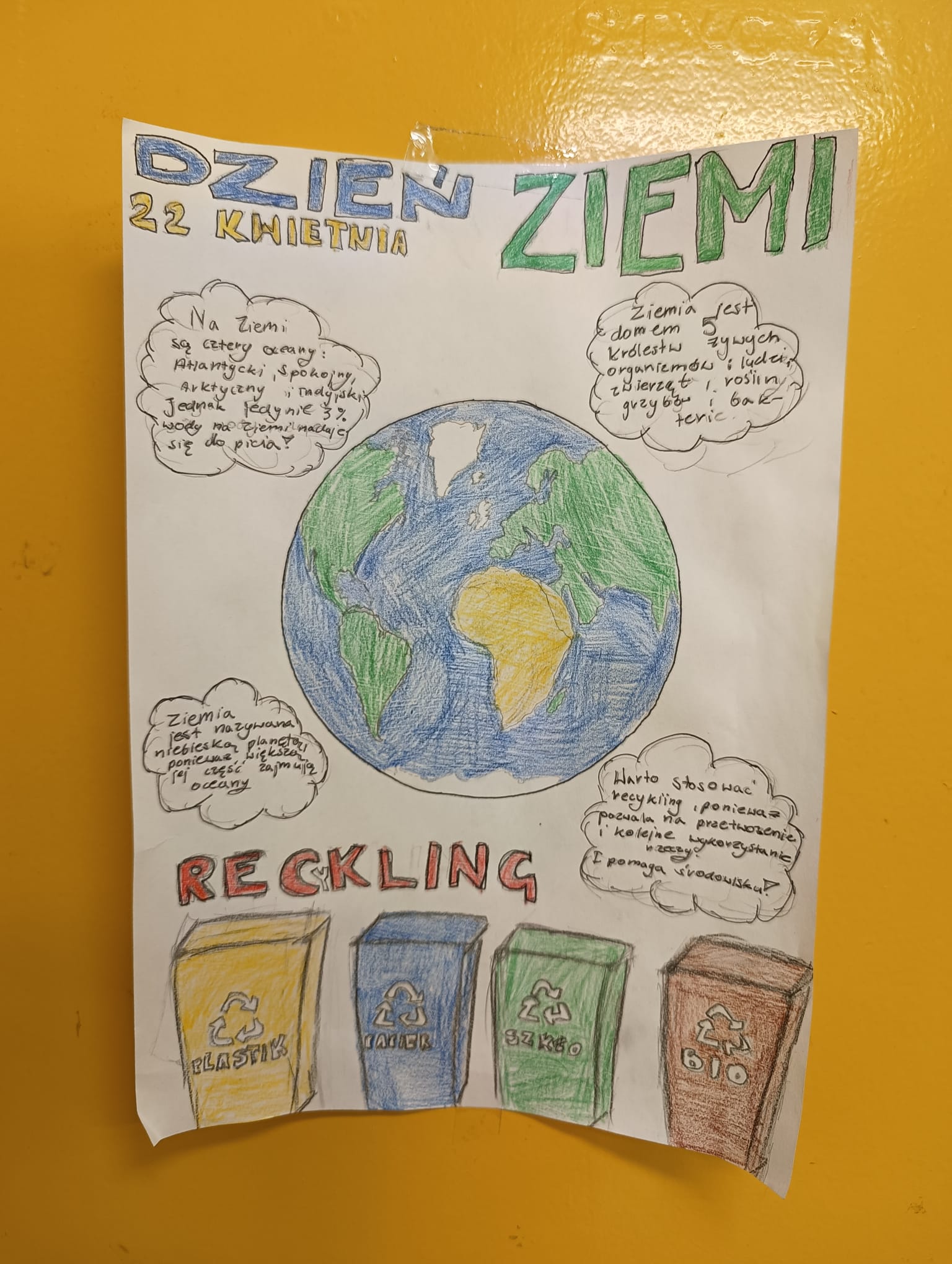 22 kwietnia obchodziliśmy w naszej szkole Światowy Dzień Ziemi. Uczniowie ubrani w barwy naszego globu (niebieski, zielony i brązowy) brali udział w różnych aktywnościach na rzecz błękitnej planety. Pomimo niskich temperatur, zarówno starsi uczniowie jak i młodsi, licznie sprzątali miejsca zabaw i wypoczynku w Świętej Katarzynie. Było też sadzenie drzewek wokół szkoły i cebulek kwiatowych w klasach. Uszkodzone budki dla owadów odzyskały dawny wygląd. W klasach powstawały lapbooki, a na korytarzach zawisły plakaty o tematyce ekologicznej. Kolejne obchody Dnia Ziemi za rok, ale o naszej planecie i konieczności dbania o jej przyrodę pamiętamy codziennie!