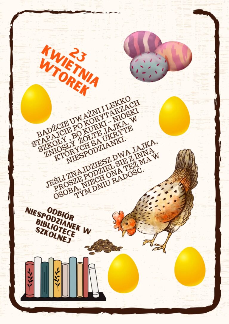 22 kwietnia, 2024 Do biblioteki nie tylko po książki Z okazji Światowego Dnia Książki i Praw Autorskich biblioteka szkolna ma wiele niespodzianek. Znajdź jajeczko i z nim przyjdź do biblioteki.