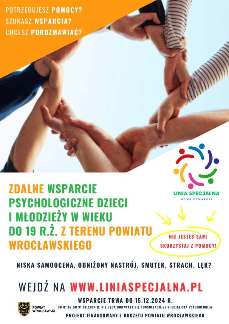Powiat Wrocławski po raz kolejny realizuje zdalne wsparcie psychologiczne dla dzieci i młodzieży z terenu Powiatu Wrocławskiego pn.: „Linia specjalna – nowe otwarcie”. Jest to kontynuacja wcześniejszych działań w obszarze zdrowia psychicznego, które pokazały dużą potrzebę kontaktu ze specjalistą psychologiem w sytuacji kryzysu psychicznego wśród młodych mieszkańców Powiatu Wrocławskiego.