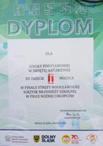 W dniu 28.05.2024r. w Środzie Śląskiej odbyły się Strefowe (międzypowiatowe) Igrzyska Młodzieży w Piłce Nożnej Chłopców klas 7-8. Po pasjonującej walce w finale chłopaki ulegli 1:2 Szkole Mistrzostwa Sportowego z Wrocławia zajmując 2 miejsce w turnieju. Gratulacje. 2 miejsce Szkoła Podstawowa w Św. Katarzynie Skład reprezentacji naszej szkoły: Kapitan zespołu Kilianowski Bartosz, Chornyi Roman, Domański Jakub, Michałowski Hubert, Nowak Jakub, Tom Aleksander, Jeżewski Michał, Kwiatkowski Dominik, Łukaszów Jakub , Żmuda Antoni. Dziękujemy Radzie Rodziców za wsparcie finansowe i umożliwienie przejazdu na zawody.