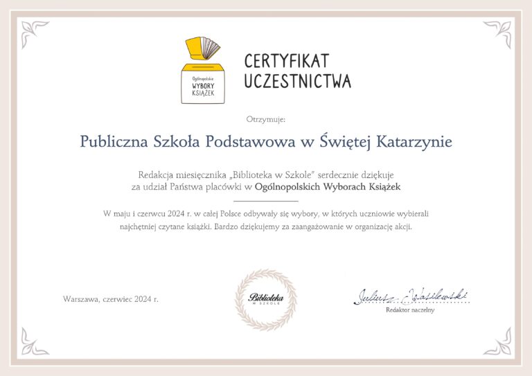 2 czerwca, 2024 Ogólnopolskie Wybory Książek 23 maja w naszej szkole odbyły się Ogólnopolskie Wybory Książek. W akcji wzięły udział wszystkie klasy 1-8.