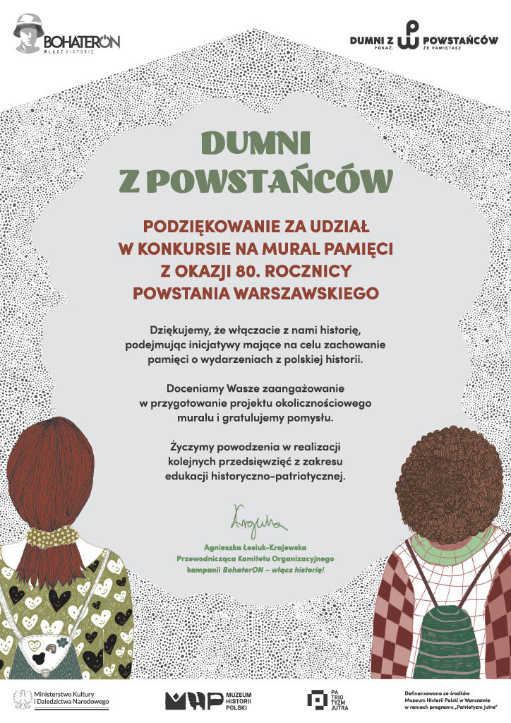 Niestety projekt nie zdobył nagrody głównej, jaką była realizacja i wykonanie muralu na ścianie budynku szkoły. Dla uczniów była to jednak cenna lekcja historii: Jesteśmy dumni z Powstańców!