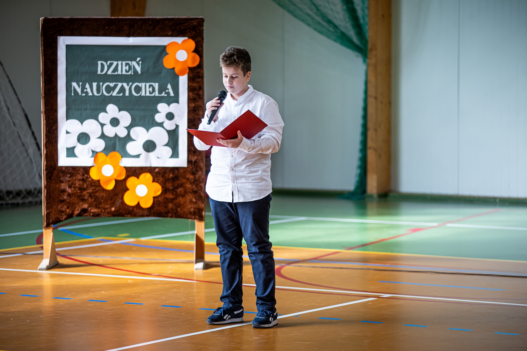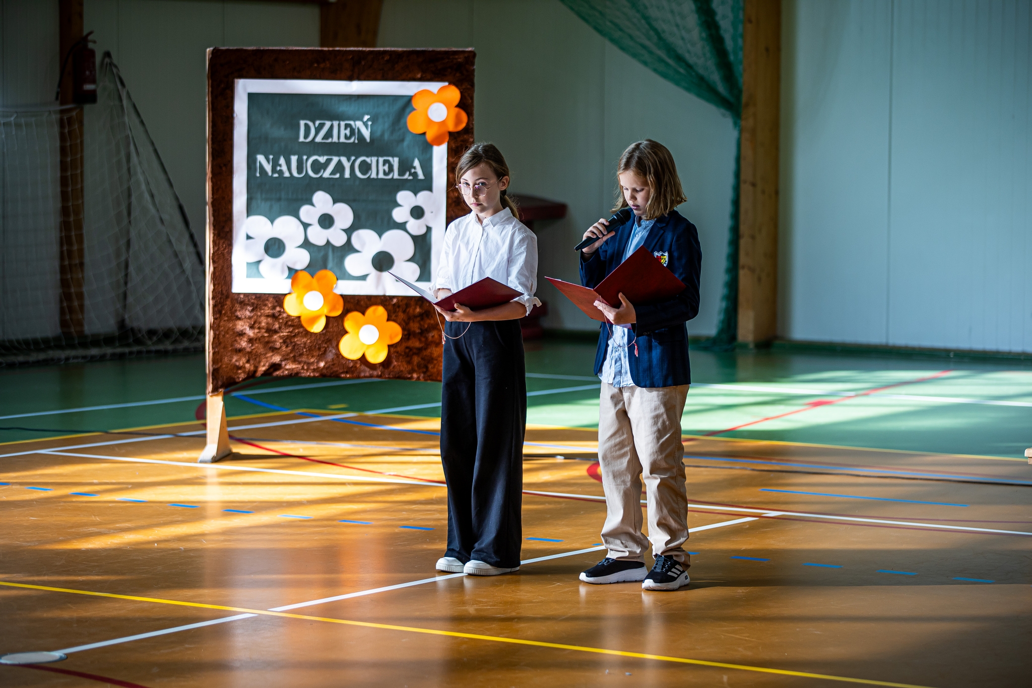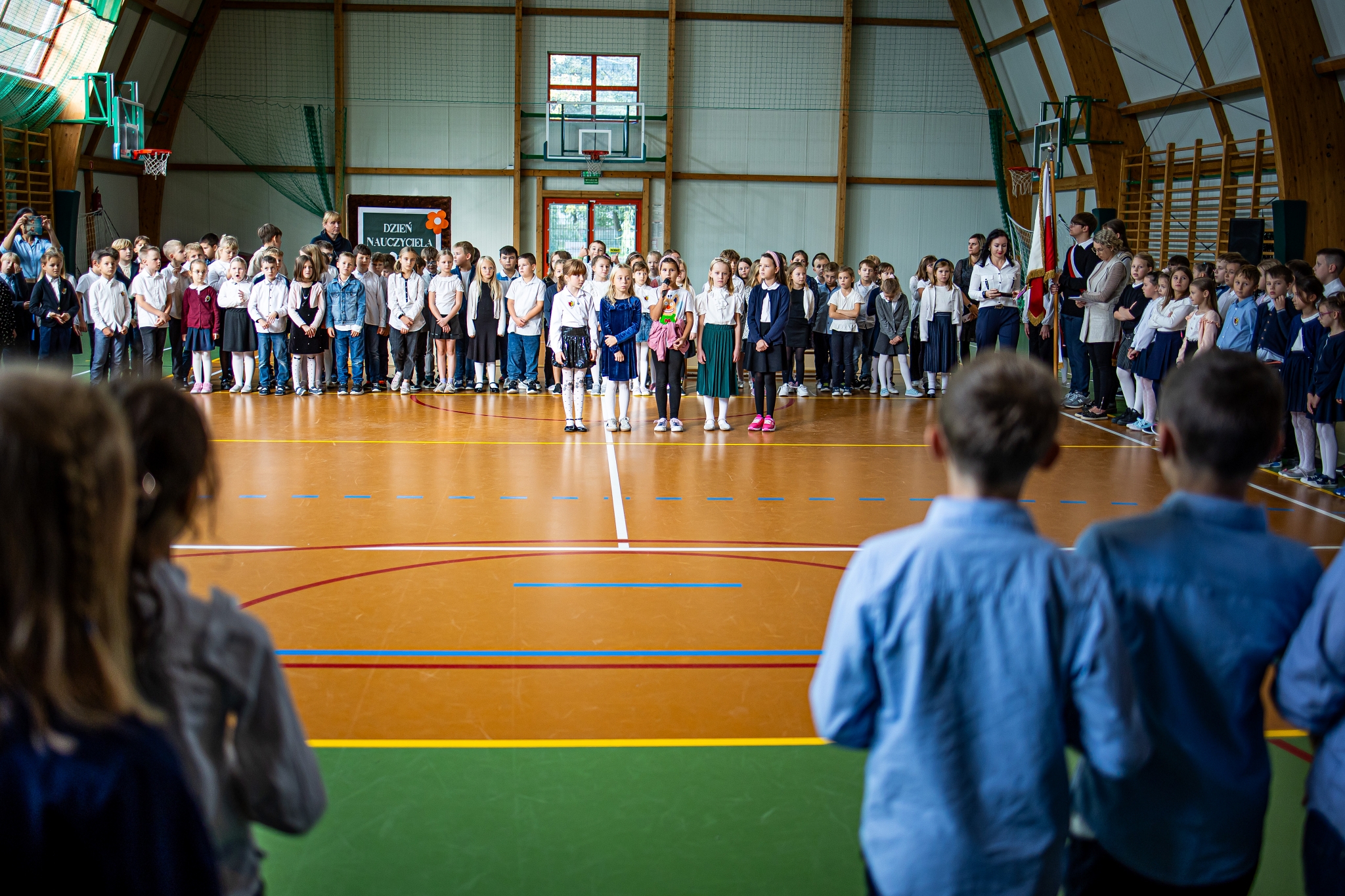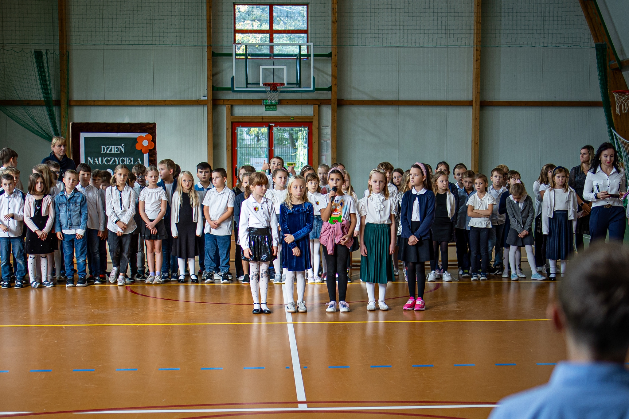Apel klas 4-8 rozpoczął kabaret ,,Pani na opak’’ w wykonaniu kl.4d, następnie uroczystość uświetnił występ wokalny Zuzi Maszyńskiej ( kl.4d), która zachwyciła wszystkich interpretacją i wykonaniem utworu ,,Cisza’’. Dużą dawkę humoru wprowadzili uczniowie kl.4c (Natalia Chrząszcz i Leon Banaś), prezentując humor z zeszytów szkolnych. Na koniec, o tym, że ,,nauczyciel to też człowiek’’ przekonywała Wiktoria Jancyk z kl. 4b, a całość imprezy poprowadził Jakub Herbuś z kl.6b, niedawno wybrany przewodniczący Samorządu Uczniowskiego w naszej szkole.