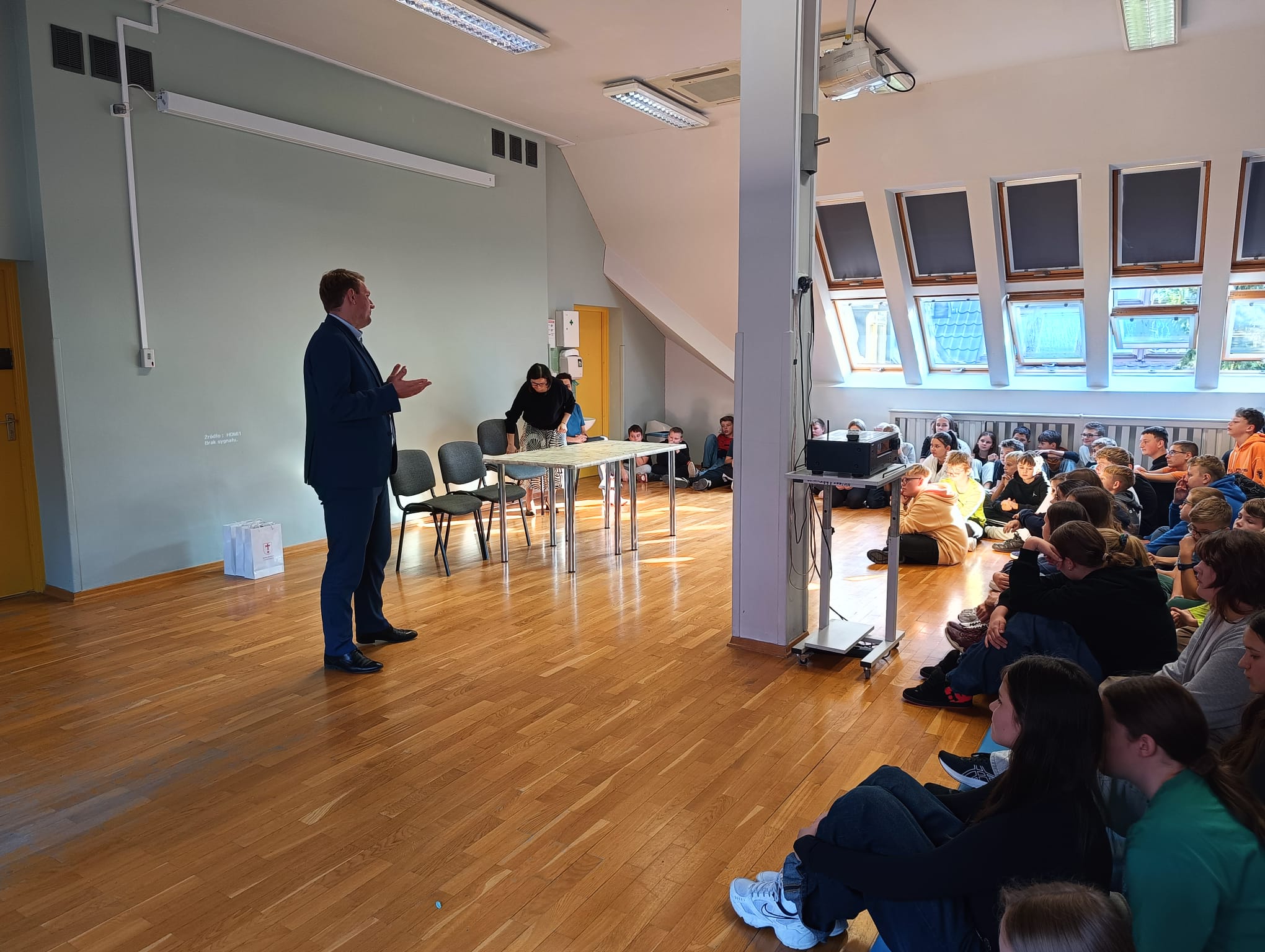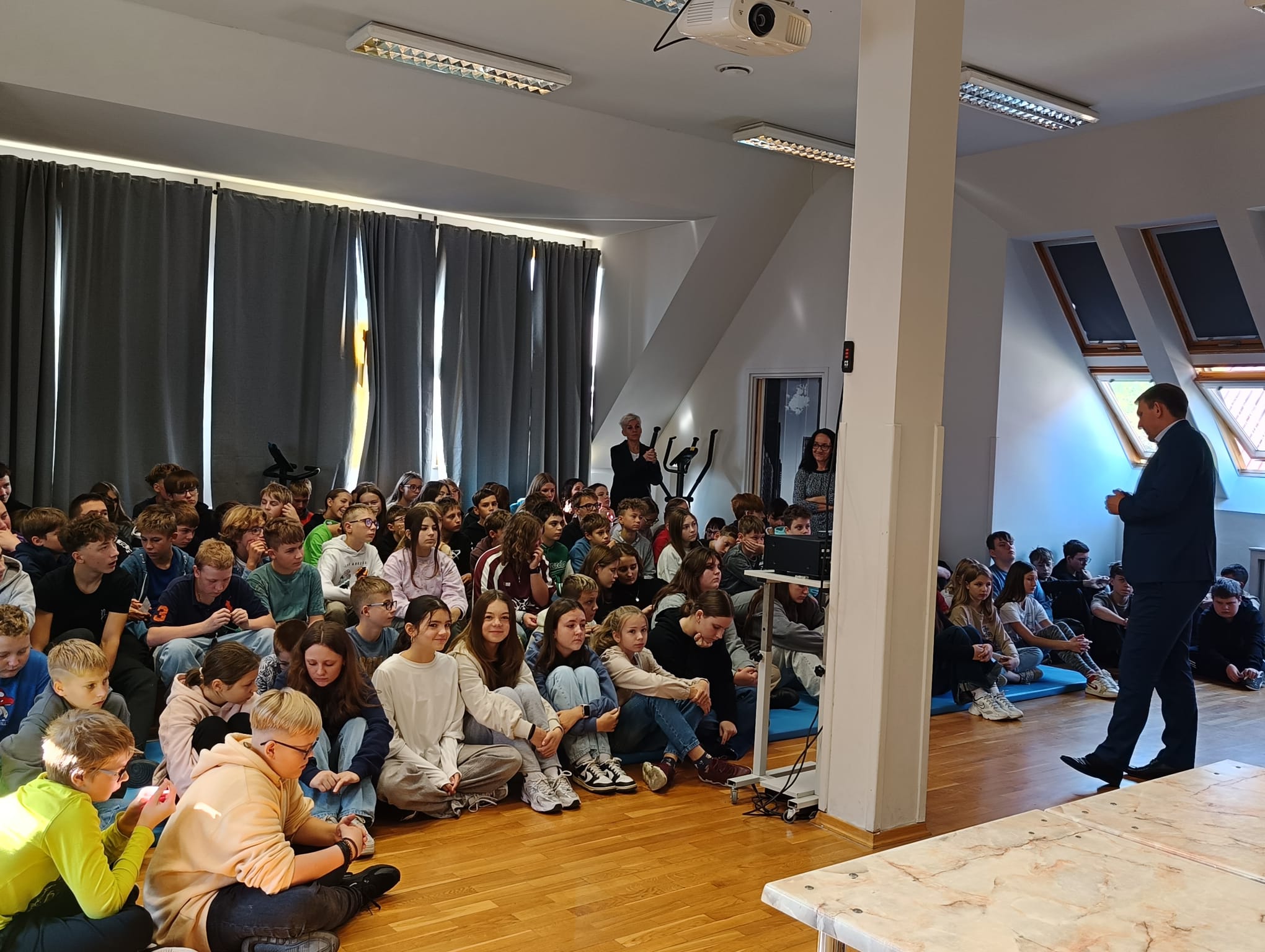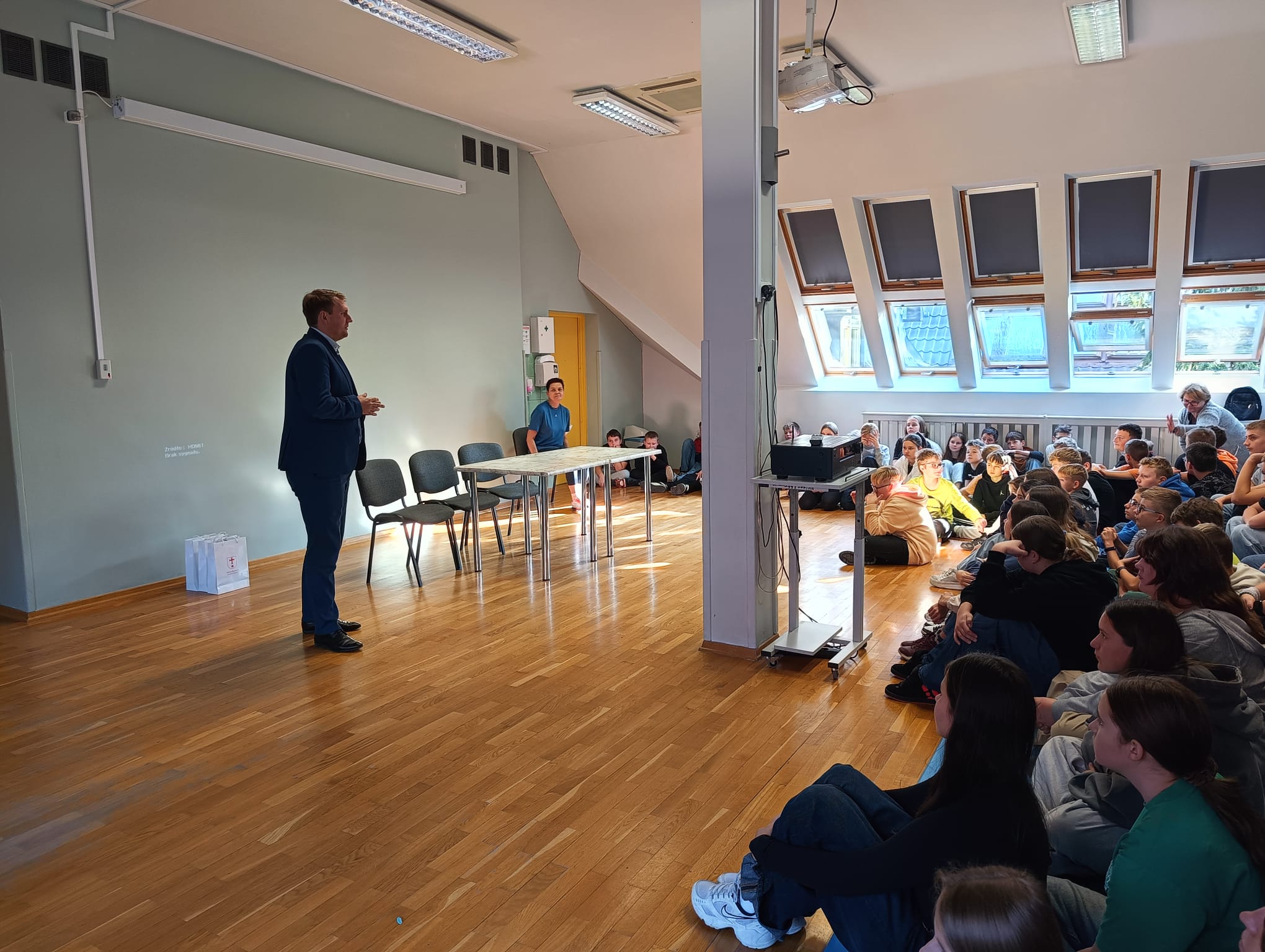 W dniu dzisiejszym (16.10.2024r.) naszą szkołę odwiedził Burmistrz Siechnic, Pan Łukasz Kropski. Celem spotkania było zachęcenie uczniów do aktywnego udziału w życiu lokalnej społeczności poprzez kandydowanie do Młodzieżowej Rady Gminy.