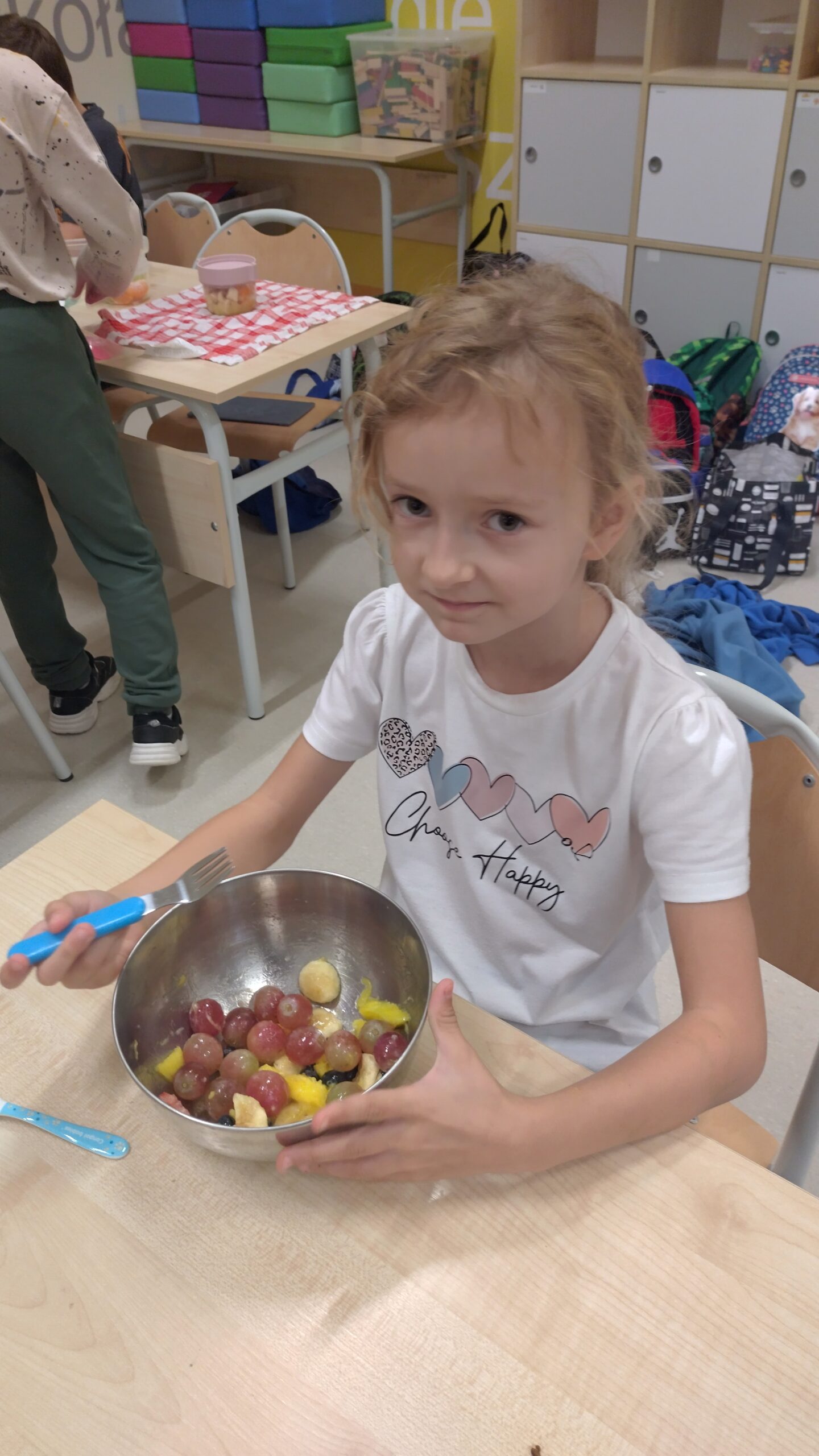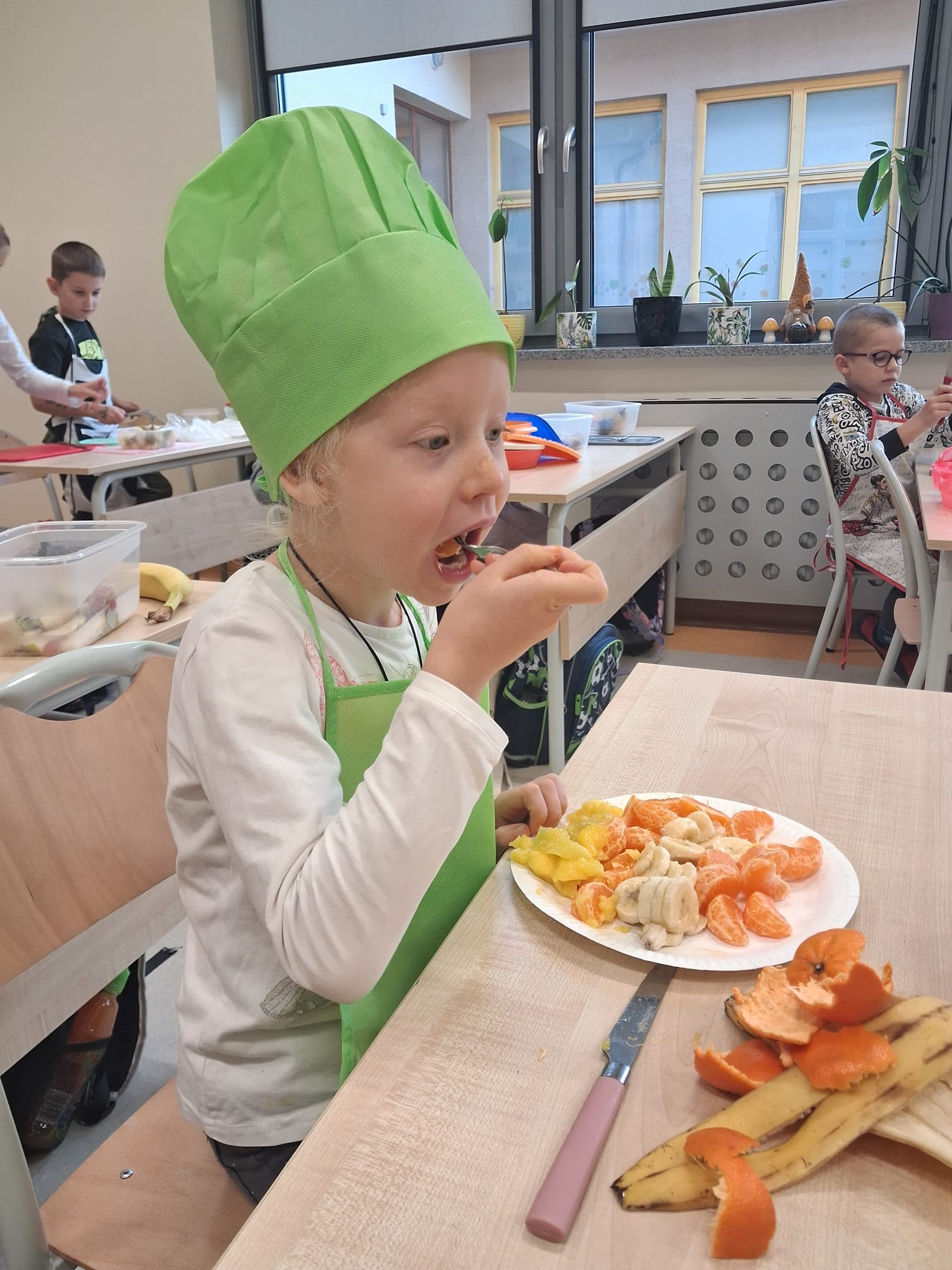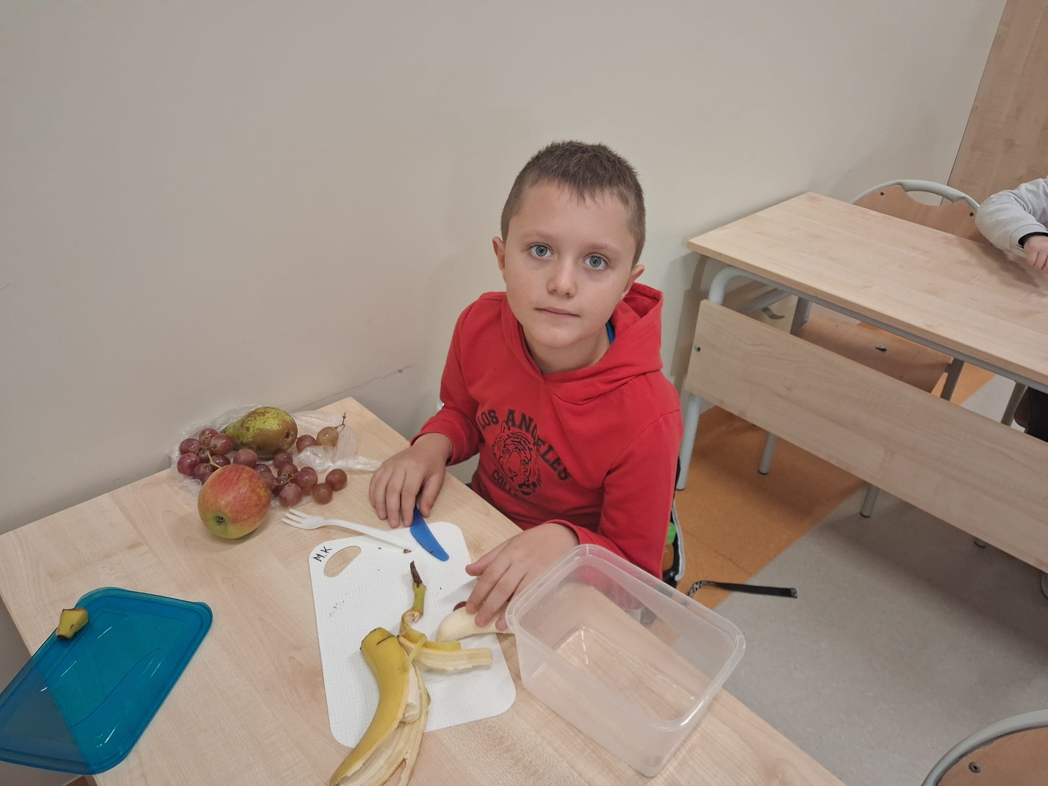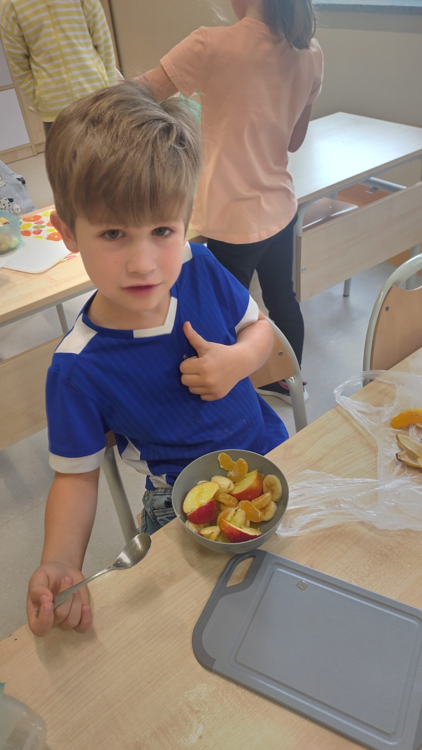 Wiemy, że owoce są smaczne i zdrowe, dostarczają nam witamin, chronią i wzmacniają nasz organizm. Dlatego uczniowie z klasy Ib oraz Id na chwilę zamienili swoje sale w kuchnię i przyrządzali sałatkę owocową. Samodzielnie zrobiona sałatka wszystkim bardzo smakowała – co widać na zdjęciach.