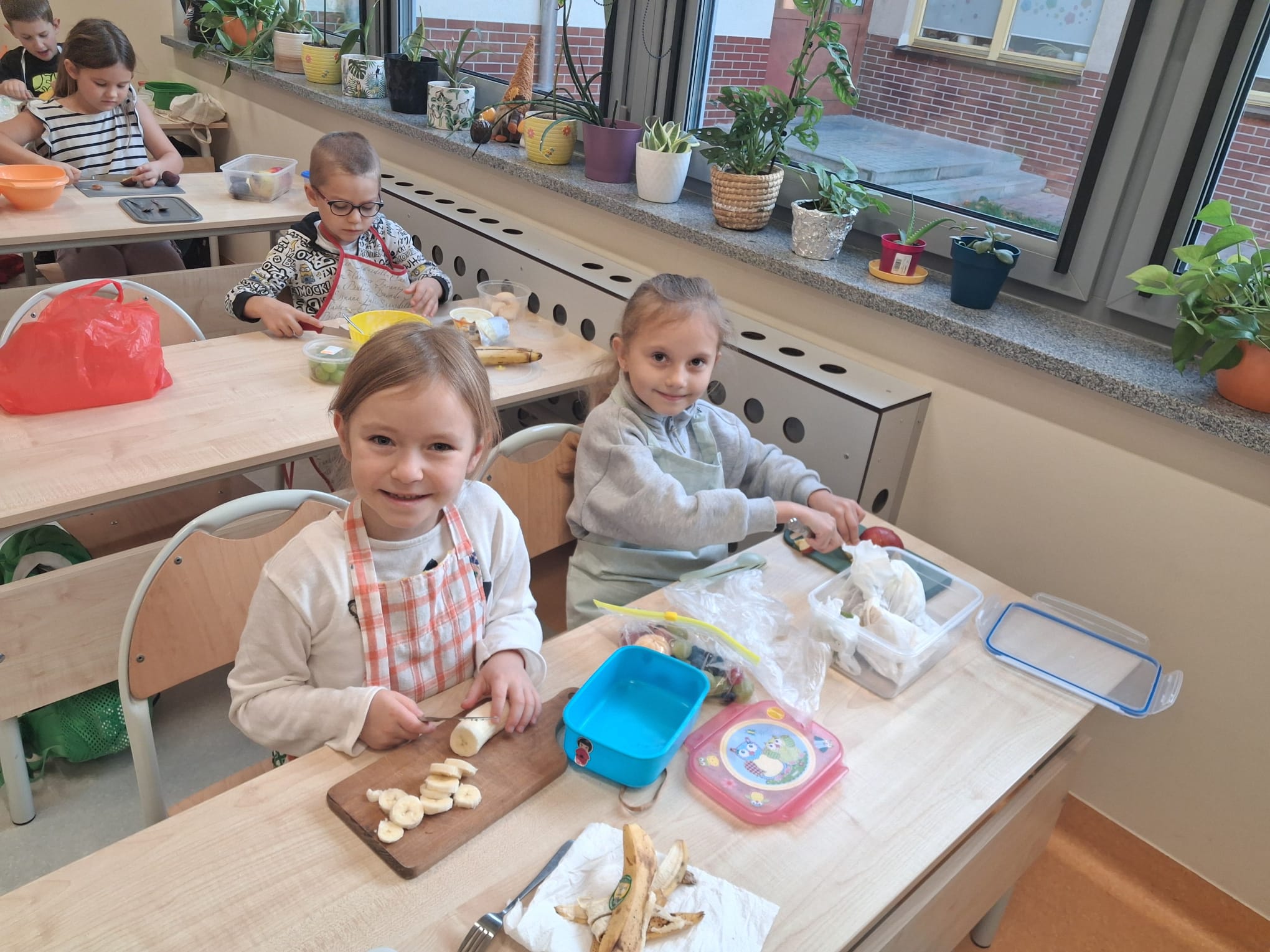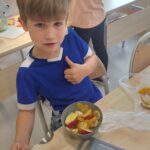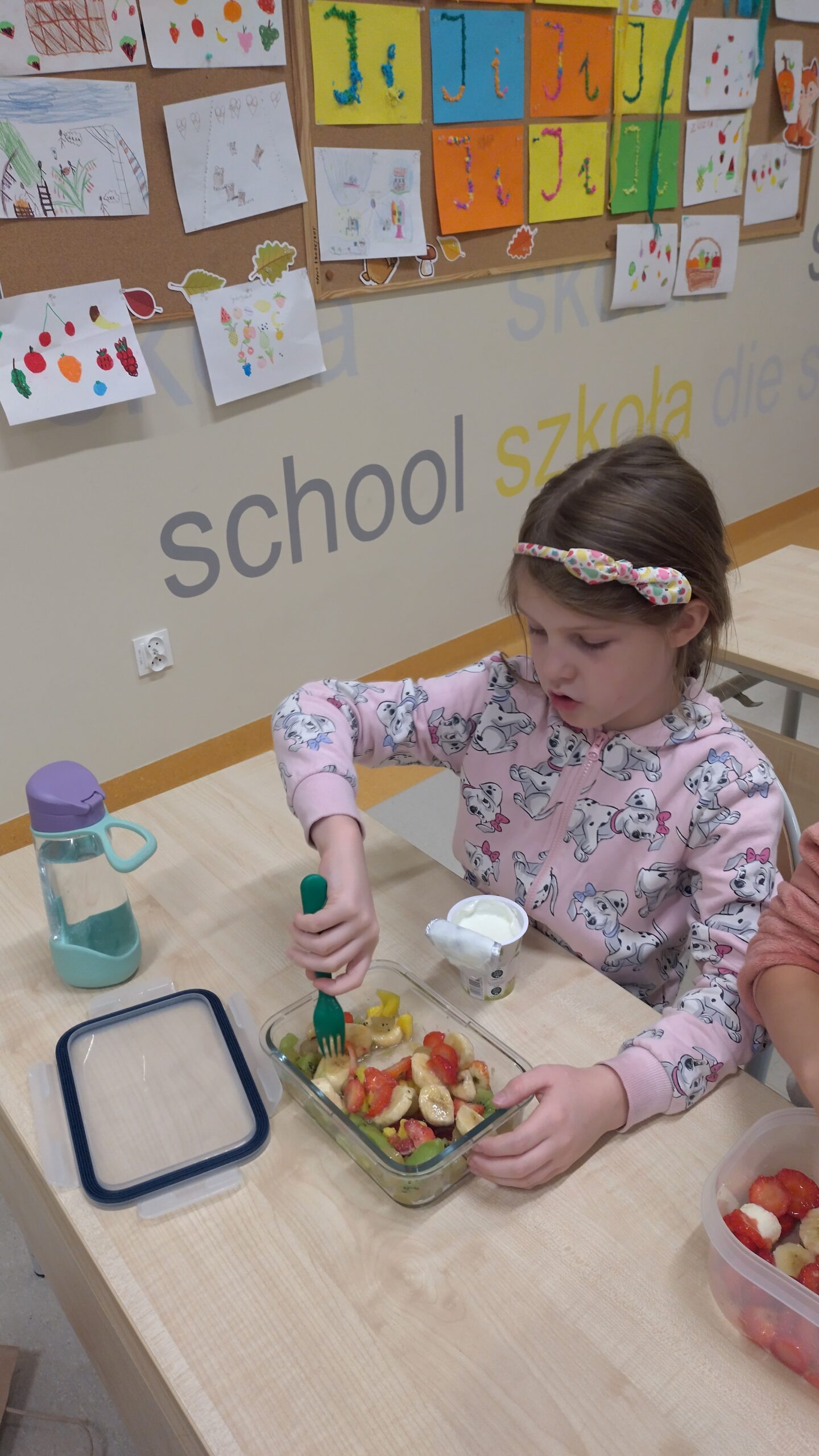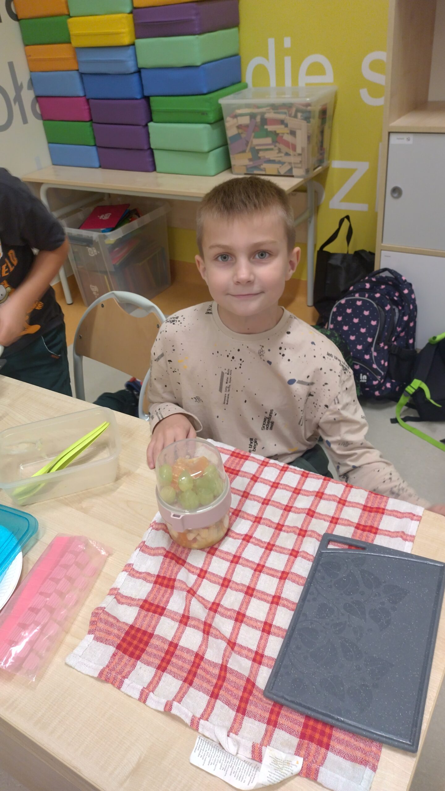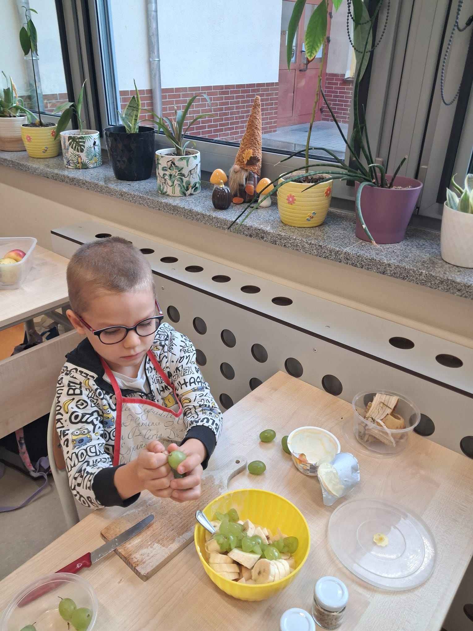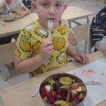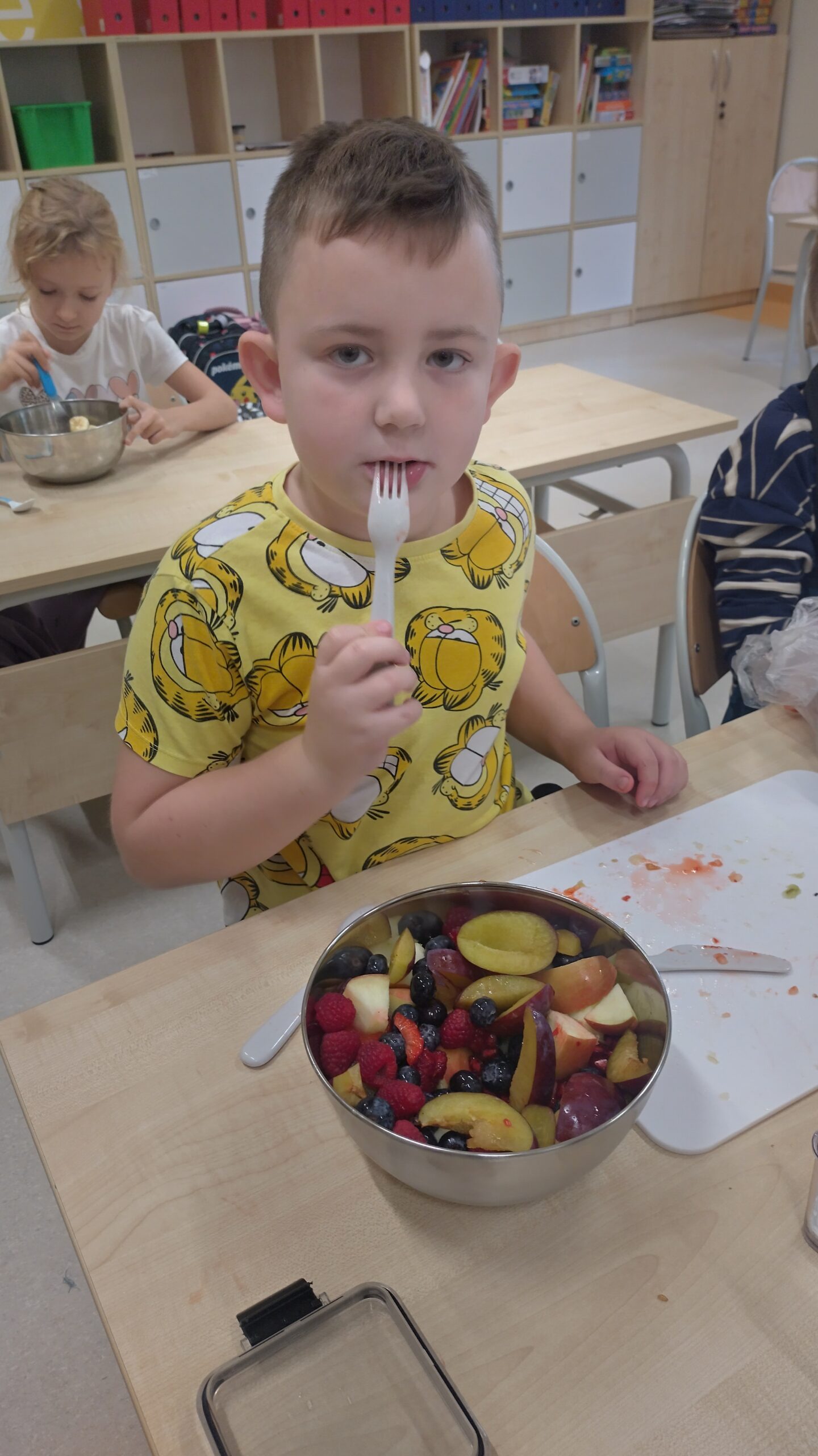 Wiemy, że owoce są smaczne i zdrowe, dostarczają nam witamin, chronią i wzmacniają nasz organizm. Dlatego uczniowie z klasy Ib oraz Id na chwilę zamienili swoje sale w kuchnię i przyrządzali sałatkę owocową. Samodzielnie zrobiona sałatka wszystkim bardzo smakowała – co widać na zdjęciach.