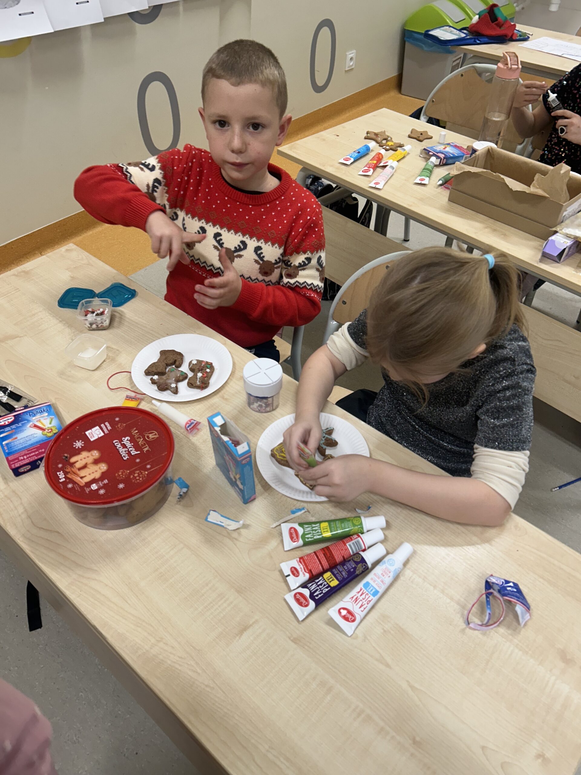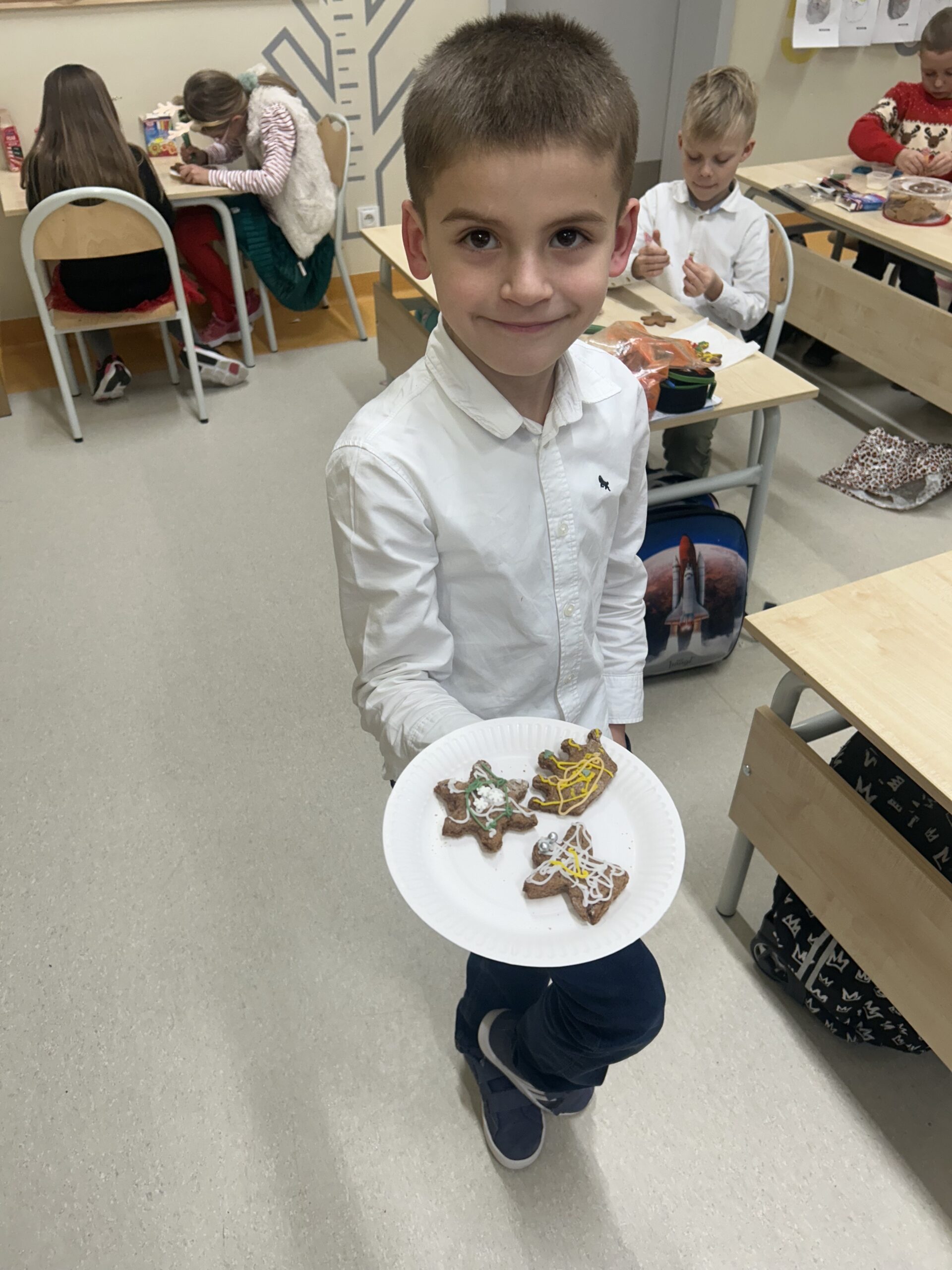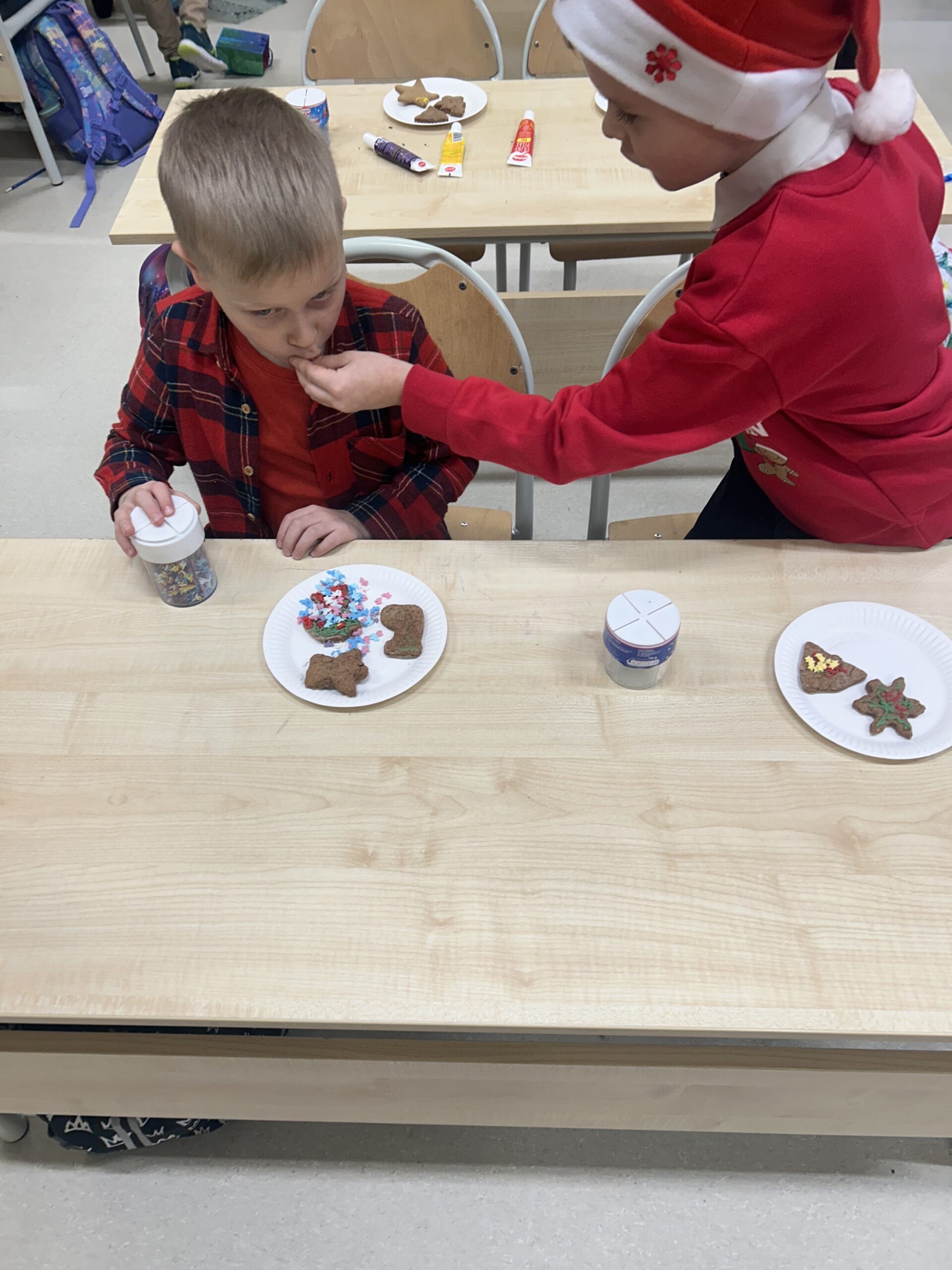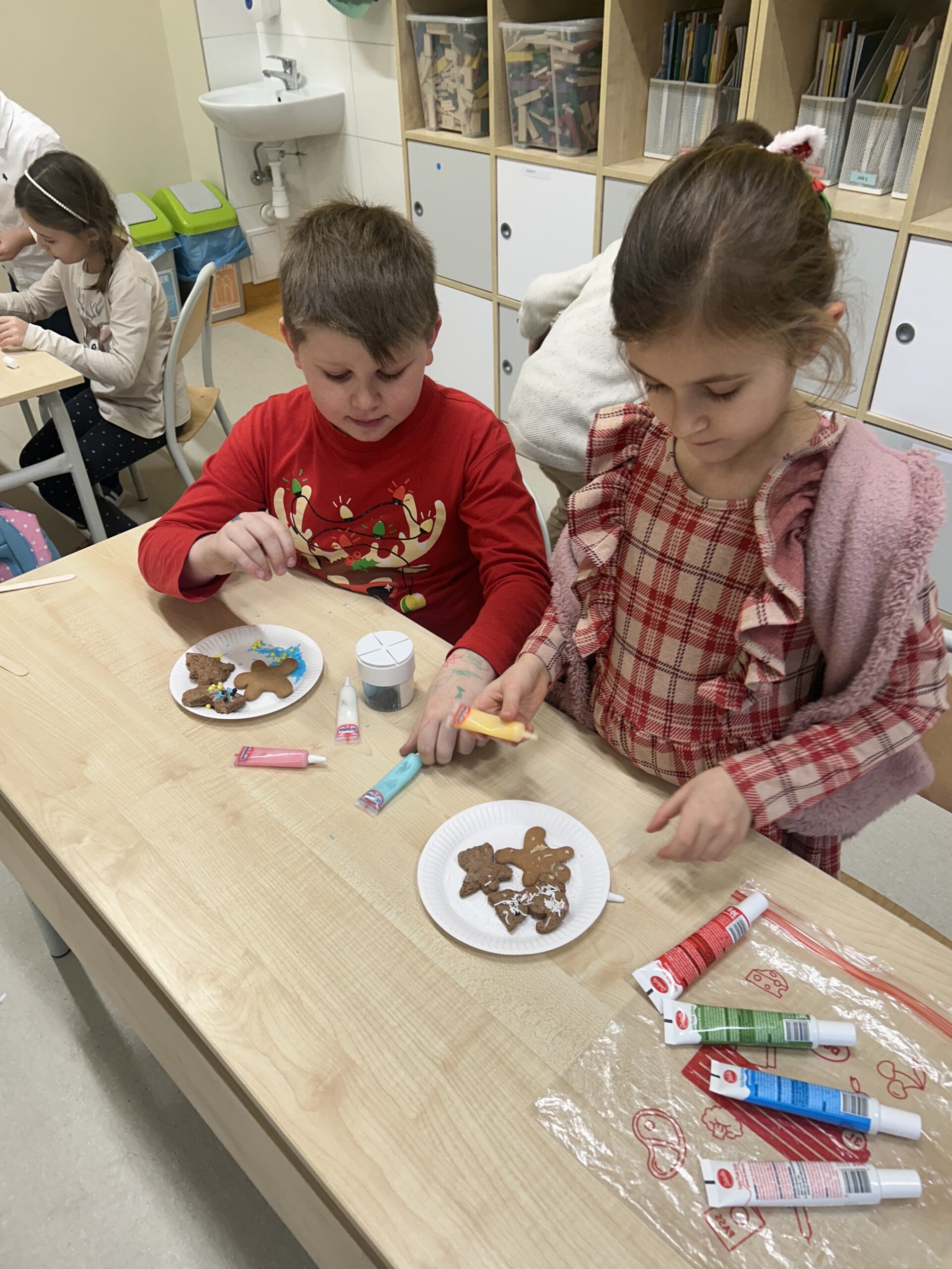Dziś na świetlicy szkolnej klasa I ozdabiała pierniczki świąteczne. Było kolorowo, pachnąco i pysznie. Dzieci z zaangażowaniem tworzyły swoje autorskie wzory, wykazując się kreatywnością i precyzją. Podczas zajęć panowała miła i świąteczna atmosfera, a uczniowie mieli okazję nie tylko rozwijać zdolności manualne, ale także poczuć magię zbliżających się świąt.