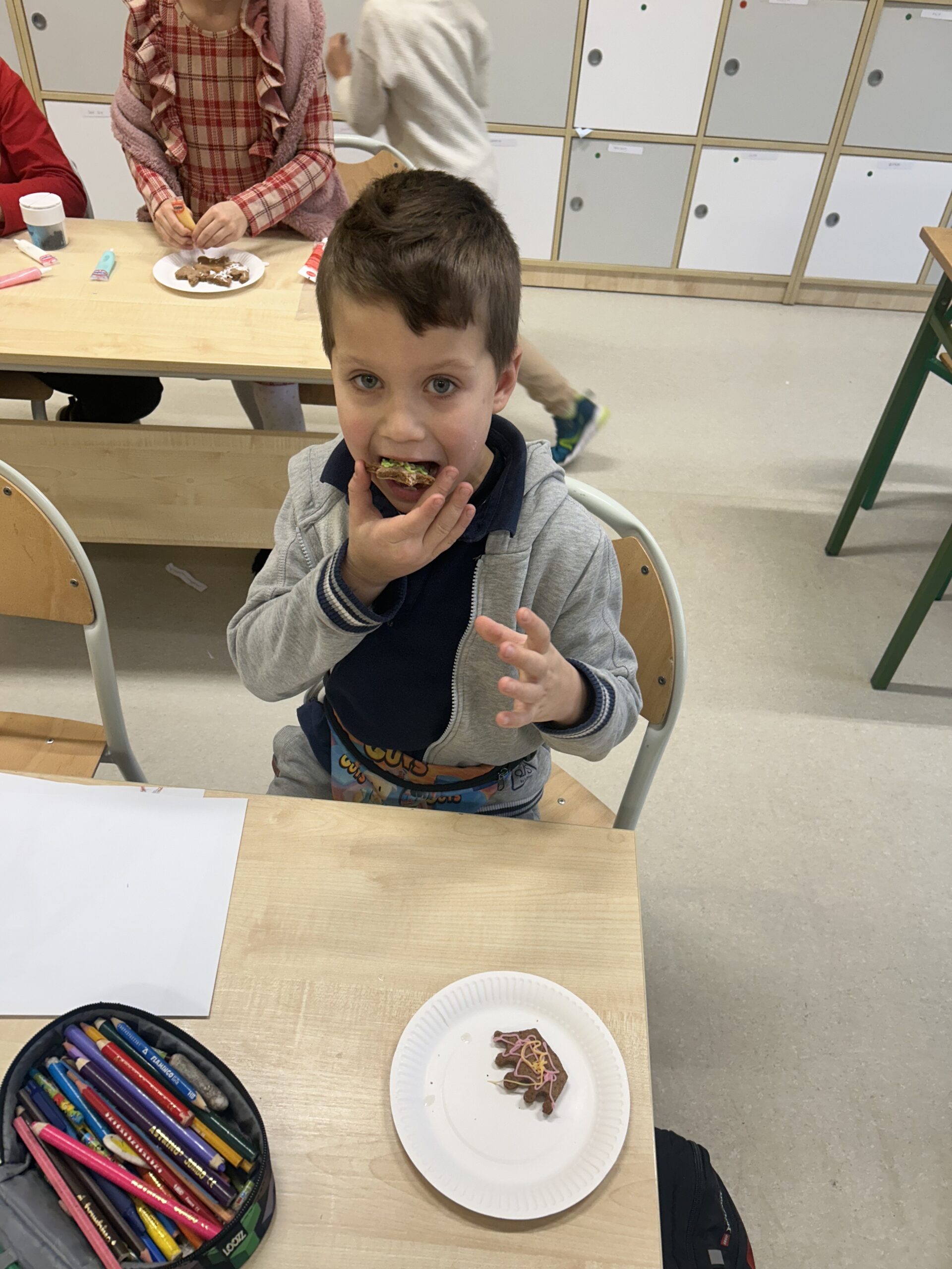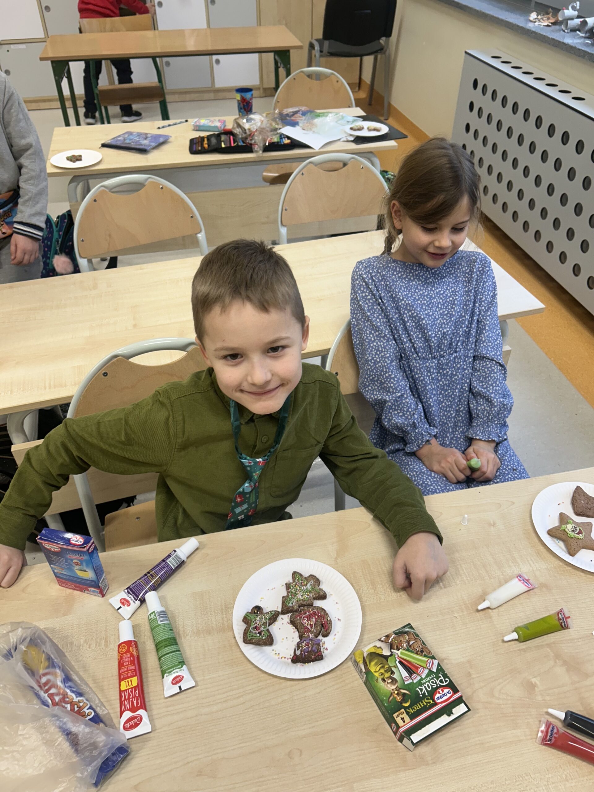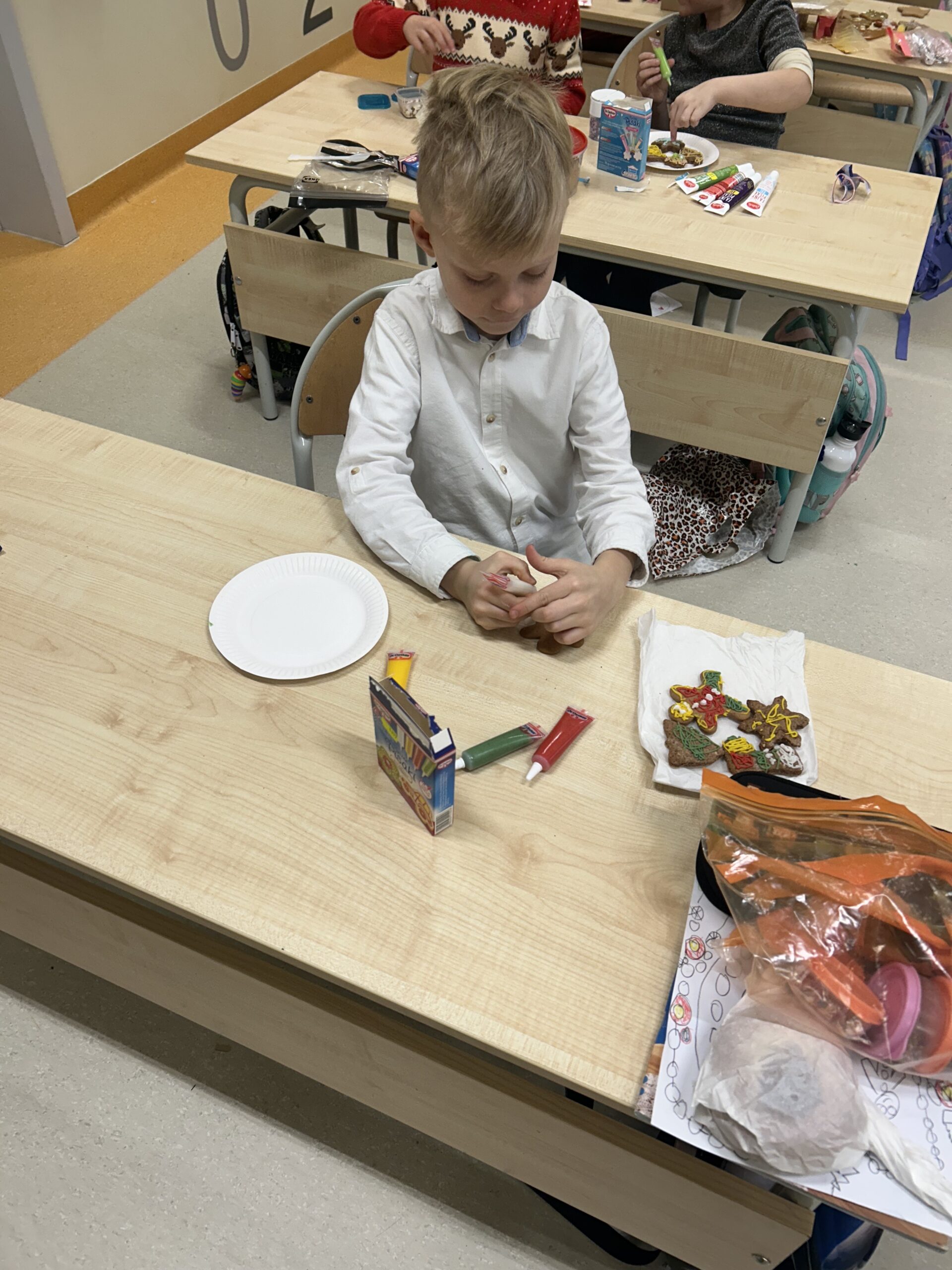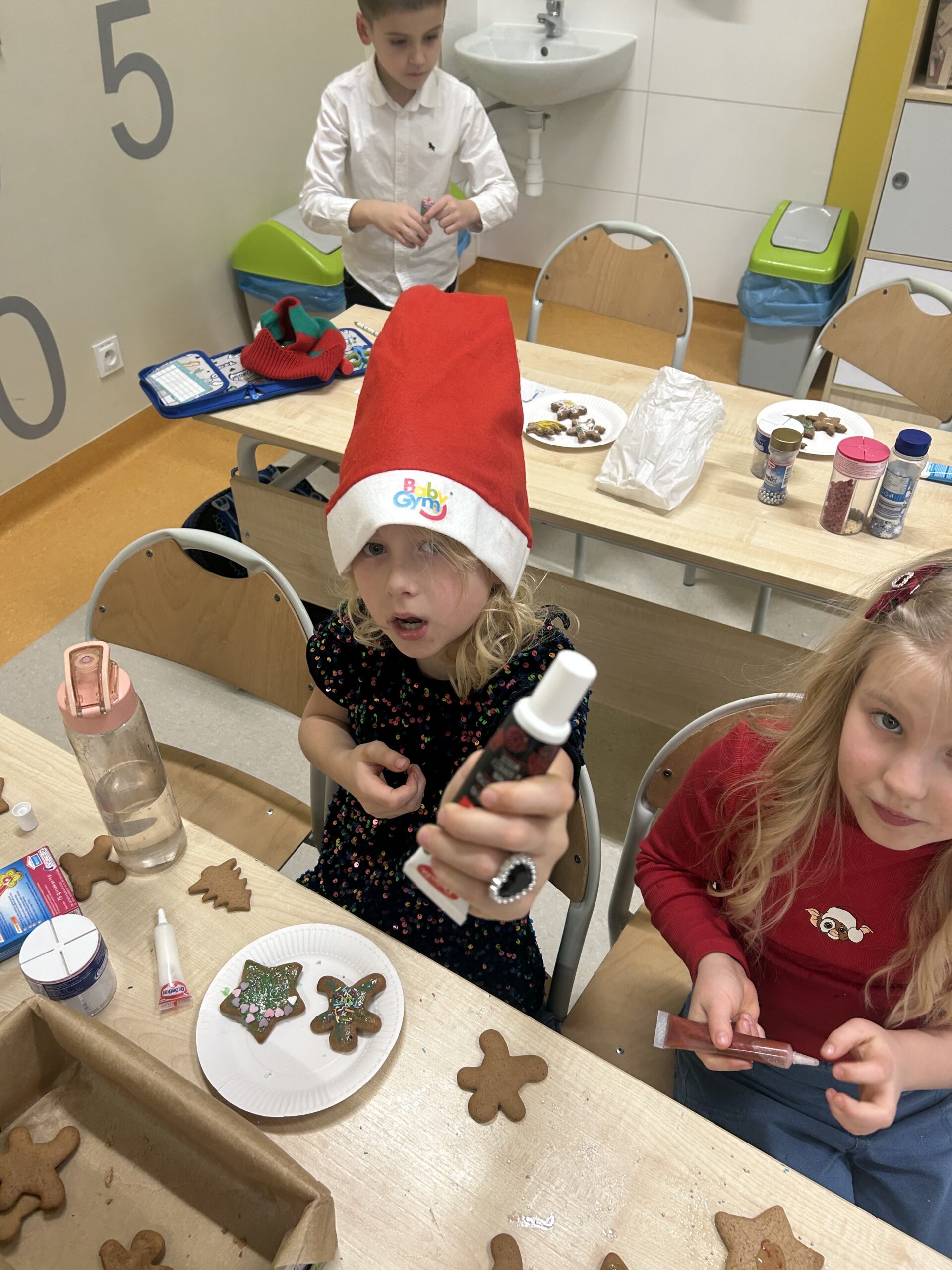 Dziś na świetlicy szkolnej klasa I ozdabiała pierniczki świąteczne. Było kolorowo, pachnąco i pysznie. Dzieci z zaangażowaniem tworzyły swoje autorskie wzory, wykazując się kreatywnością i precyzją. Podczas zajęć panowała miła i świąteczna atmosfera, a uczniowie mieli okazję nie tylko rozwijać zdolności manualne, ale także poczuć magię zbliżających się świąt.