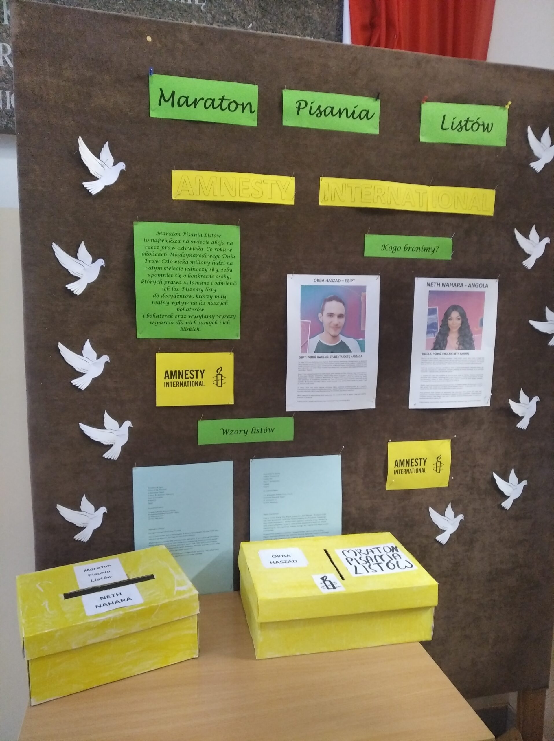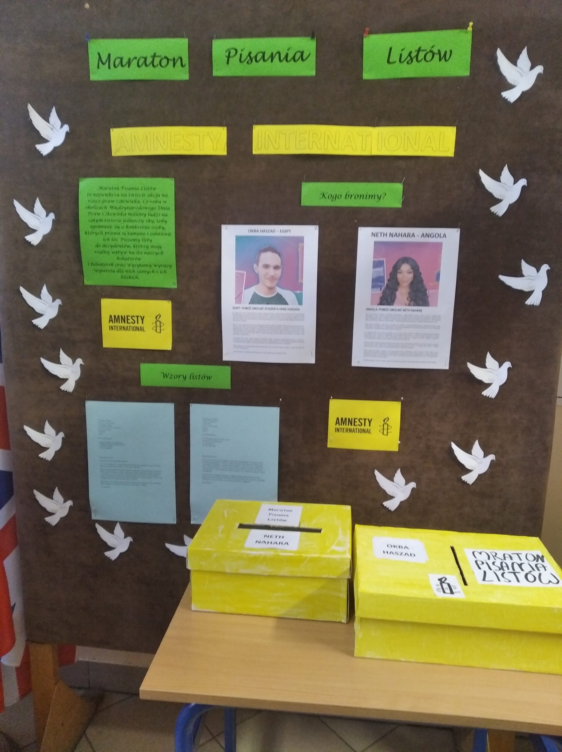 W dniach 3-5 grudnia 2024 r. w naszej szkole odbył się Maraton Pisania Listów organizowany przez Amnesty International. W tym roku pisaliśmy listy w obronie Neth Nahary, która trafiła do więzienia za skrytykowanie prezydenta Angoli na swoim kanale na TikToku oraz Okby Haszada z Egiptu, który znajduje się w areszcie tymczasowym w odwecie za działalność swojego brata na rzecz praw człowieka. Udało nam się napisać w ich obronie 55 listów. Mamy nadzieję, że dzięki mobilizacji tysięcy wolontariuszy na całym świecie Neth i Okba wkrótce znowu będą cieszyć się wolnością.