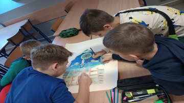 Uczniowie klas piątych realizowali temat związany z omawianym na lekcjach plastyki stylem gotyckim. Wykonane przez nich prace dekorują klasę. Piękne projekty gotyckich okien to efekt pracy grupowej, która uczy współpracy, podziału zadań oraz integruje uczestników.