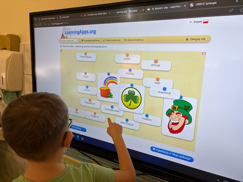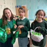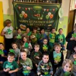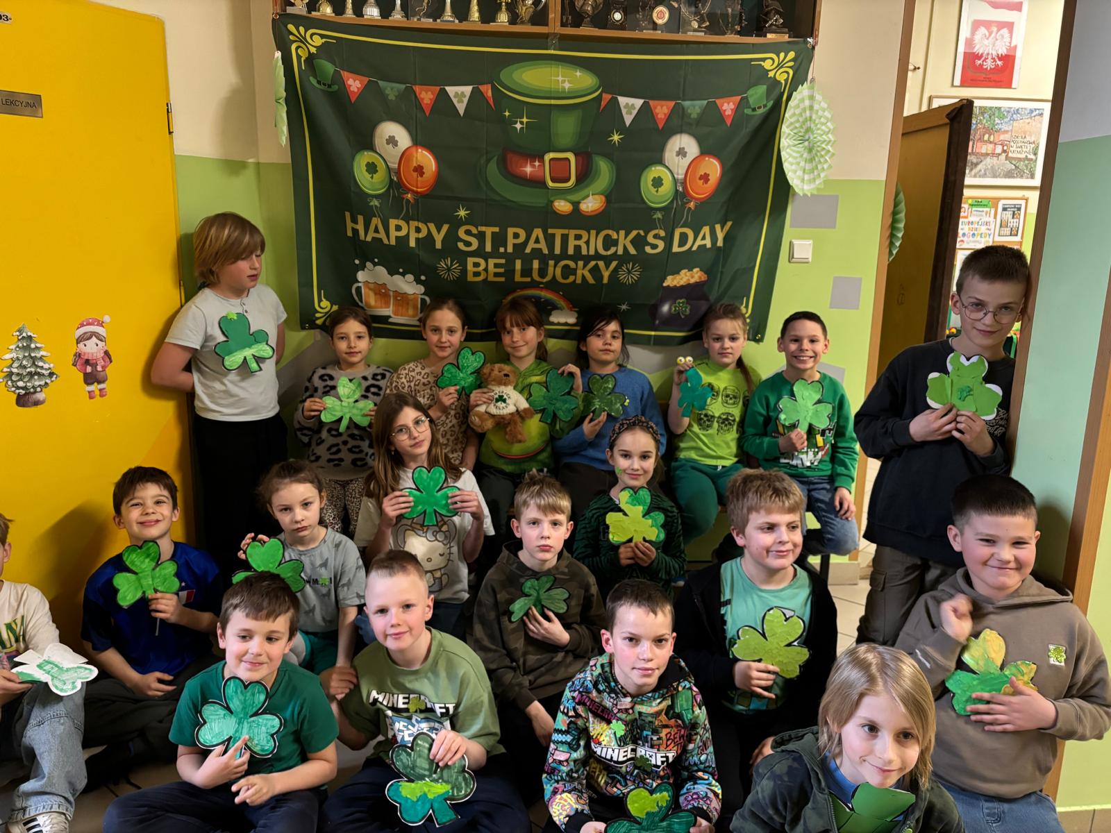 A u nas w szkole już od zeszłego piątku podziwiać można było wystawę plakatów tematycznych i zielonych kapeluszy. W klasach 1-8 odbyły się lekcje kulturowe i quizy (na zdjęciu w klasie 2c). Skrzaty z klasy 3c zdobyły 1 miejsce w quizie na temat Dnia Świętego Patryka. Osoby ubrane na zielono, otrzymywały naklejkę – koniczynkę.