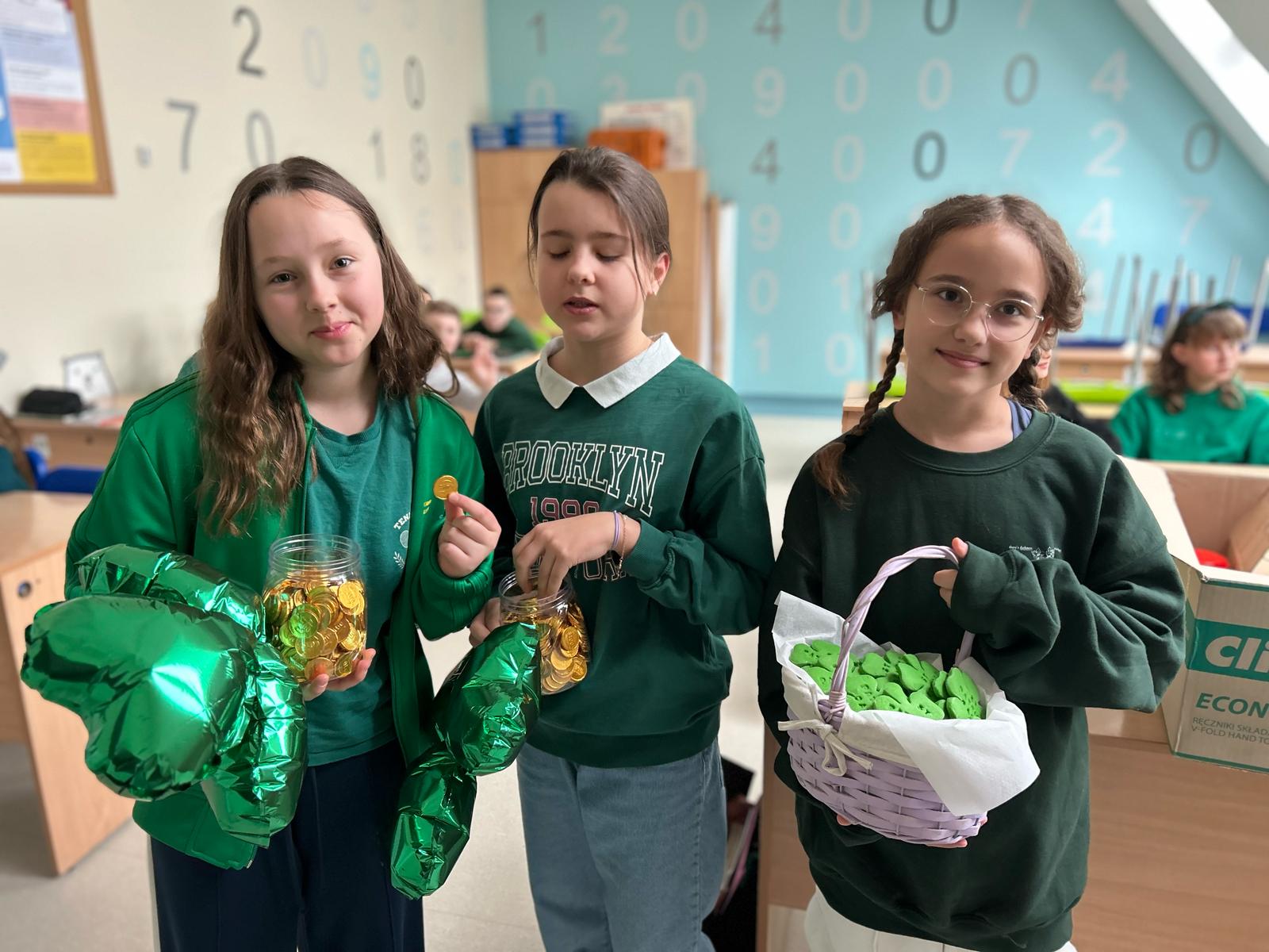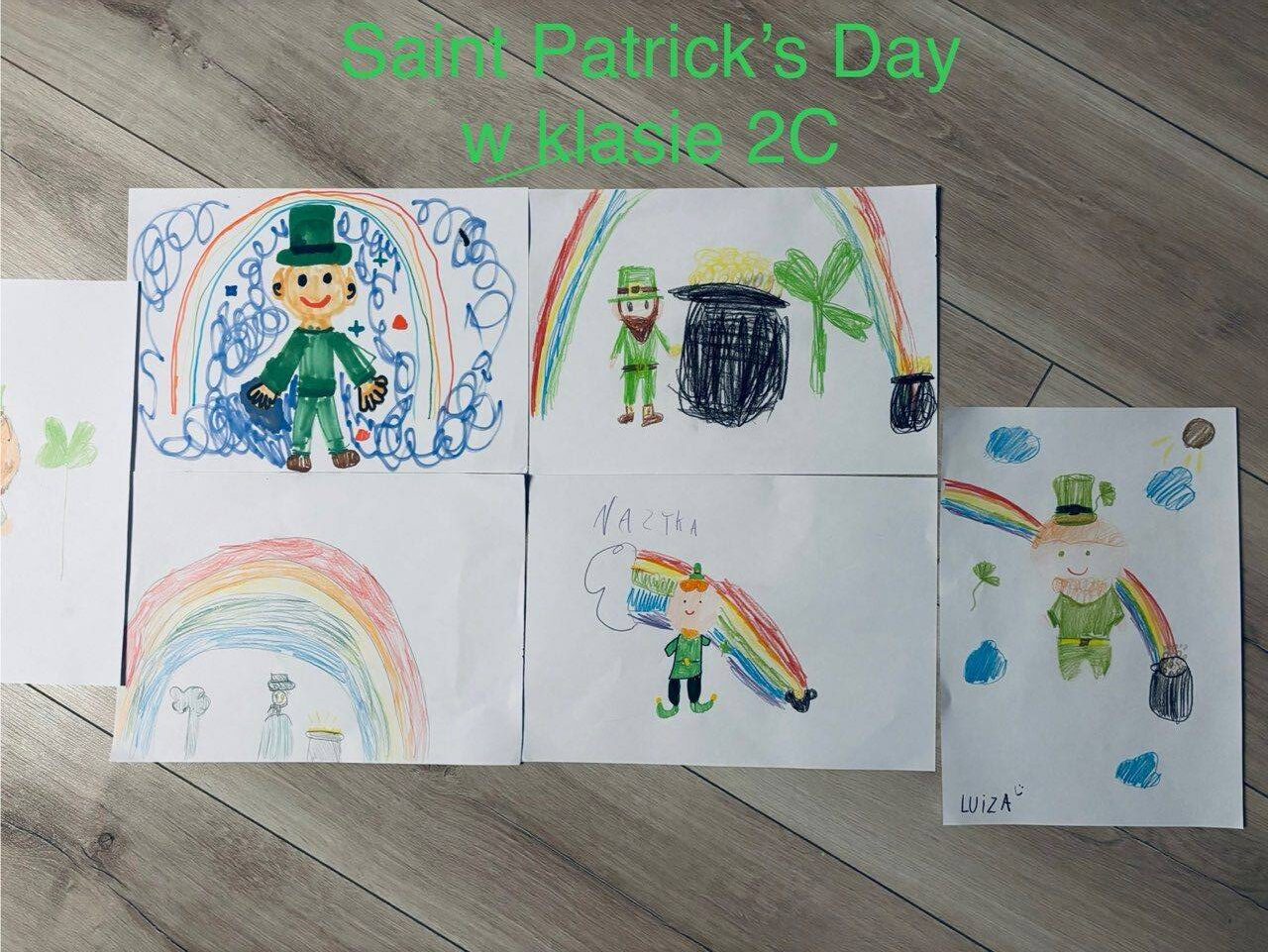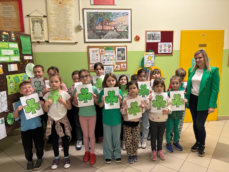 Cieszy nas fakt, że uczniowie z tak wielkim zaangażowaniem celebrowali Dzień Świętego Patryka, zakładając zielone ubrania i akcesoria oraz wykonując prace plastyczne w klasach 1-3 (na zdjęciu klasa 1e). Całość obchodów dnia Świętego Patryka uświetniła degustacja zielonych ciastek o kształcie koniczynek (dziękujemy!!!). Złote czekoladowe monety roznosiły skrzaty z klasy 5b.