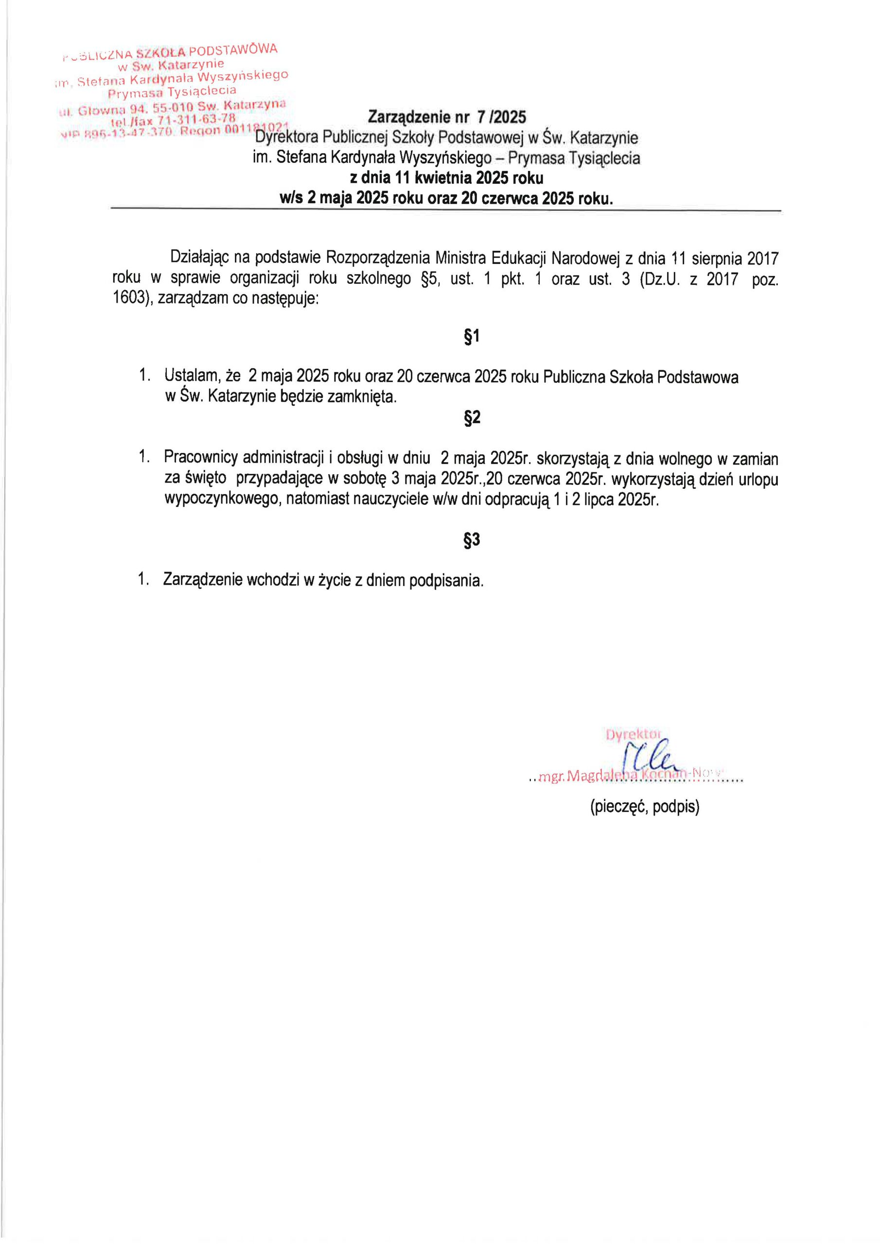 21 maja, 2025 Zarządzenia Dyrektora Szkoły Zarządzenie Dyrektora Publicznej Szkoły Podstawowej im. Stefana Kardynała Wyszyńskiego Prymasa Tysiąclecia w Świętej Katarzynie w sprawie Zasad korzystania z placu zabaw przy Publicznej Szkole Podstawowej poza godzinami zajęć szkolnych Zarządzenie Dyrektora Publicznej Szkoły Podstawowej im. Stefana Kardynała Wyszyńskiego Prymasa Tysiąclecia w Świętej Katarzynie w/s 2 maja i 20 czerwca 2025 r.