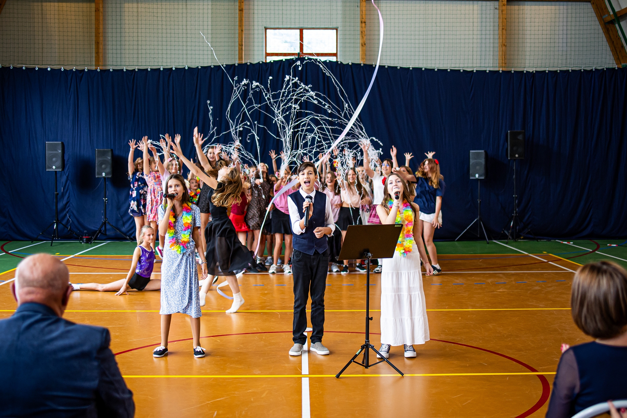 - występy wokalne i taneczne w wykonaniu uczniów klas 5a i 7b, chóru szkolnego oraz solistów: Zuzanny Maszyńskiej, Jagody Włosowicz, a także absolwenta szkoły Bruna Zalewskiego i Pani Anny Szul – mamy jednej z uczennic.