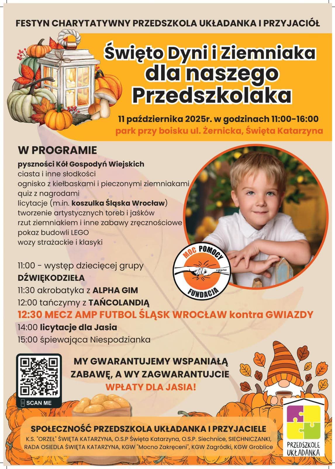 Serdecznie zapraszamy na rodzinny festyn charytatywny „Święto Dyni i Ziemniaka dla Naszego Przedszkolaka”. Cały dochód z wydarzenia zostanie przeznaczony na zakup protez i rehabilitację dla Jasia.