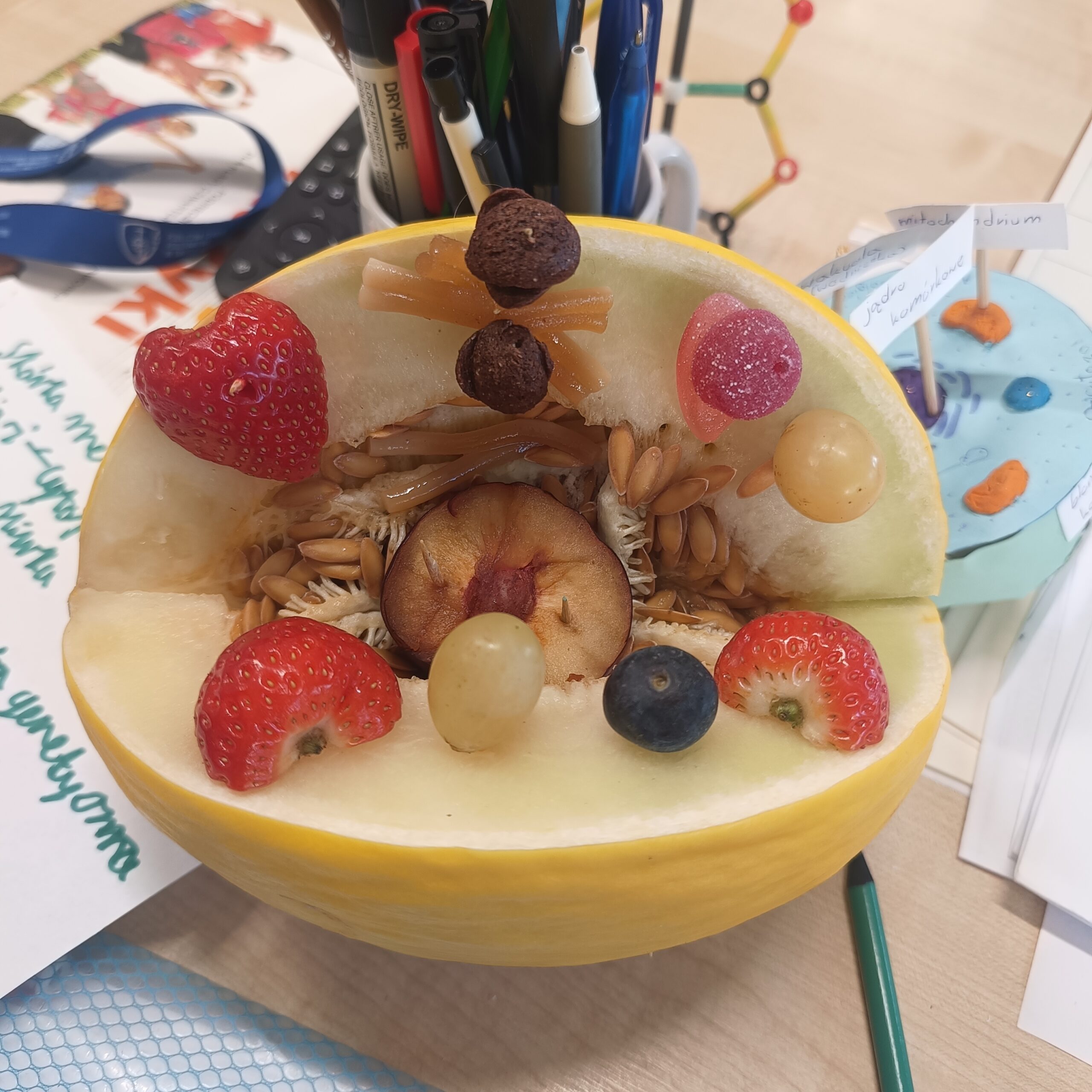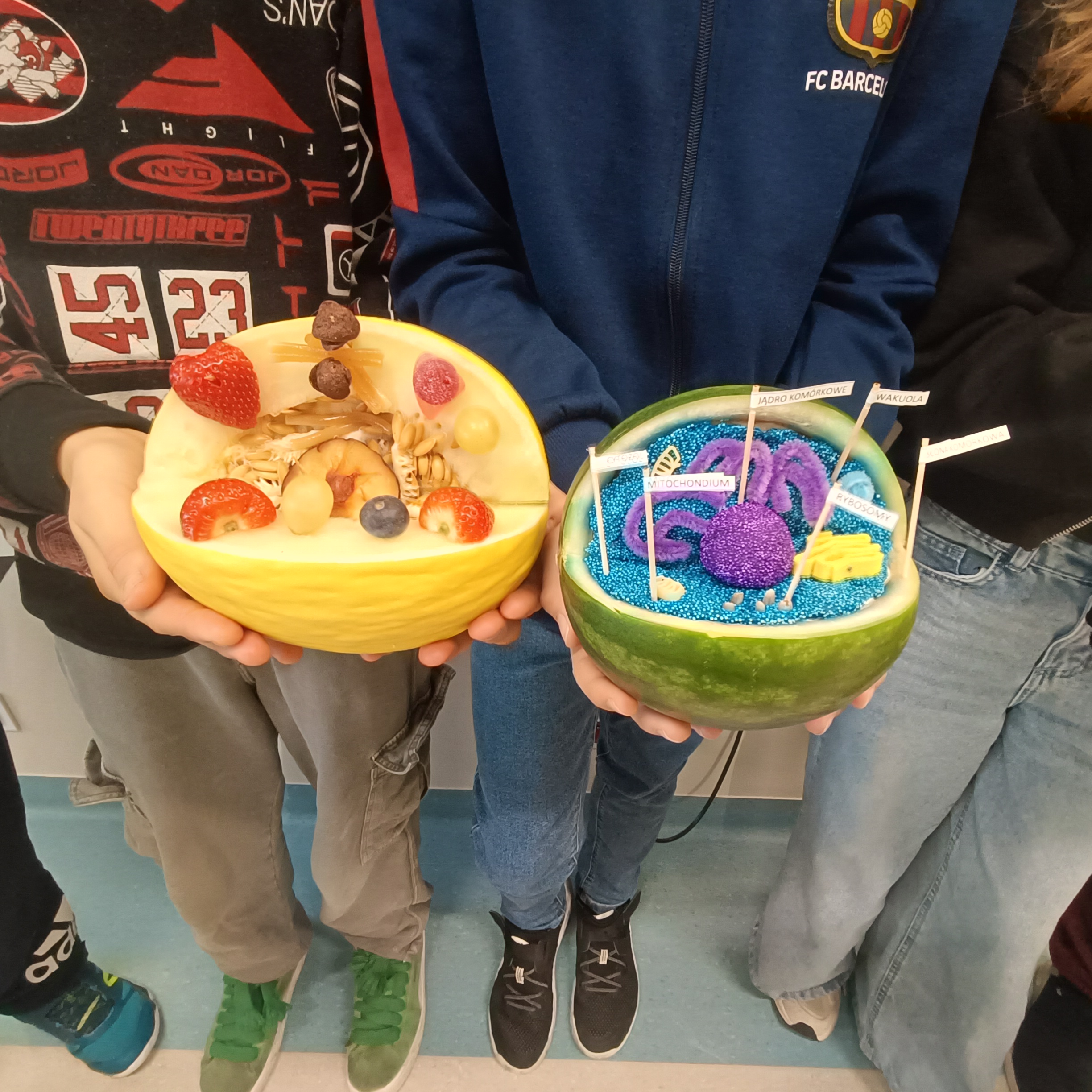 W klasie 5D odbyła się wyjątkowa lekcja biologii, podczas której uczniowie przedstawiali przygotowane przez siebie przestrzenne modele komórek. Wykonali własne interpretacje komórki roślinnej lub zwierzęcej, wykorzystując różnorodne materiały – od owoców, plasteliny i papieru po elementy recyklingowe. Dzięki temu nie tylko utrwalili wiedzę o budowie komórki, ale także rozwijali swoją kreatywność.
