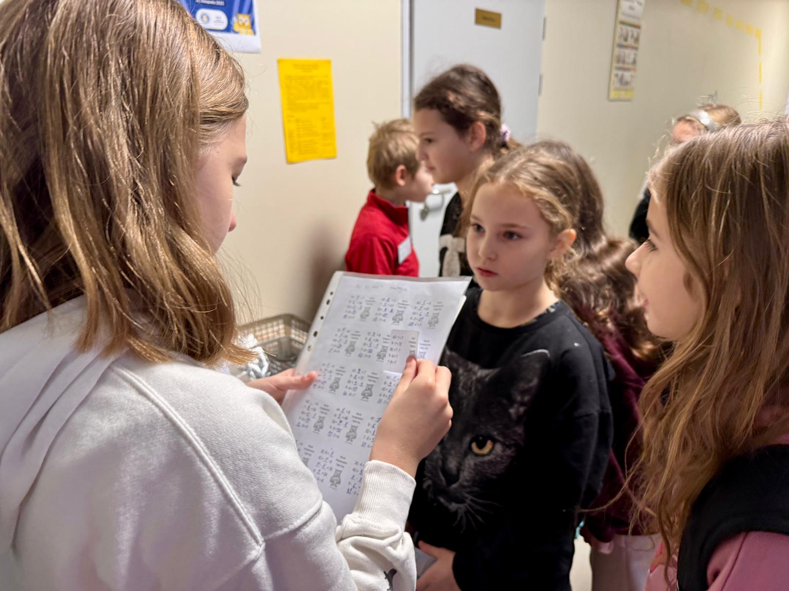 Egzaminatorami byli uczniowie, którzy wykazali się bezbłędną znajomością tabliczki mnożenia podczas przeprowadzonych wcześniej testów na czas: 31 uczniów z klas 4-6. Technicznego wsparcia (wycinanie dekoracji, przygotowanie podkładek, uzupełnianie identyfikatorów, itd.) uydzieliło kilku uczniów z klas 5a i 6b – pięknie dziękujemy.