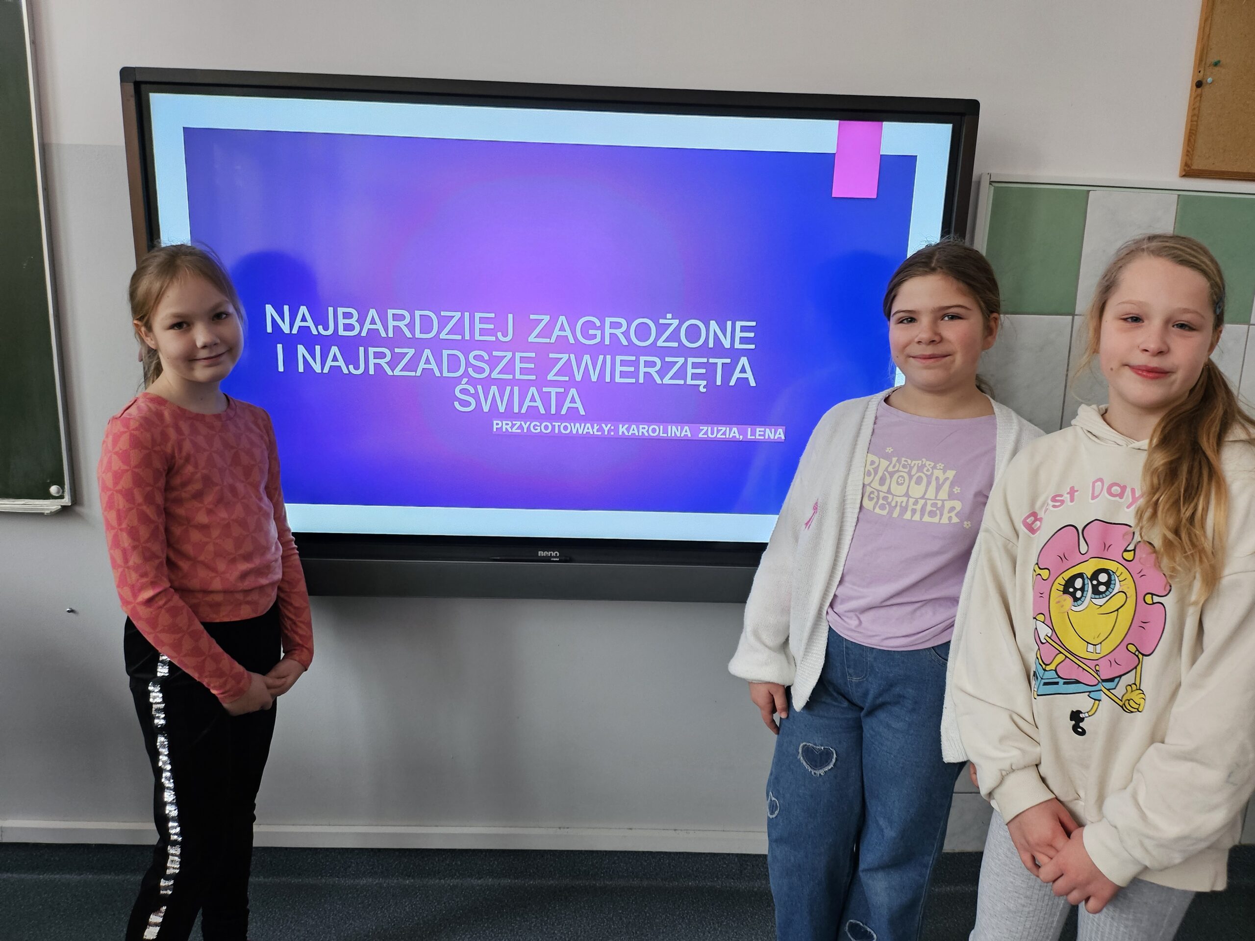 W minioną środę uczennice klasy 3c przeprowadziły dla swoich koleżanek i kolegów lekcję o zagrożonych i najrzadszych zwierzętach na świecie. Karolina, Zuzia i Lena podzieliły się wiedzą na temat m.in. lisa polarnego, prolemura, morświna. Na koniec, w ramach utrwalenia nowo zdobytej wiedzy, dziewczynki przygotowały wykreślanki.