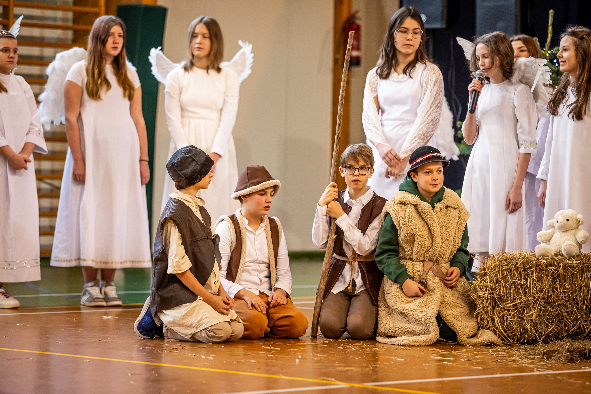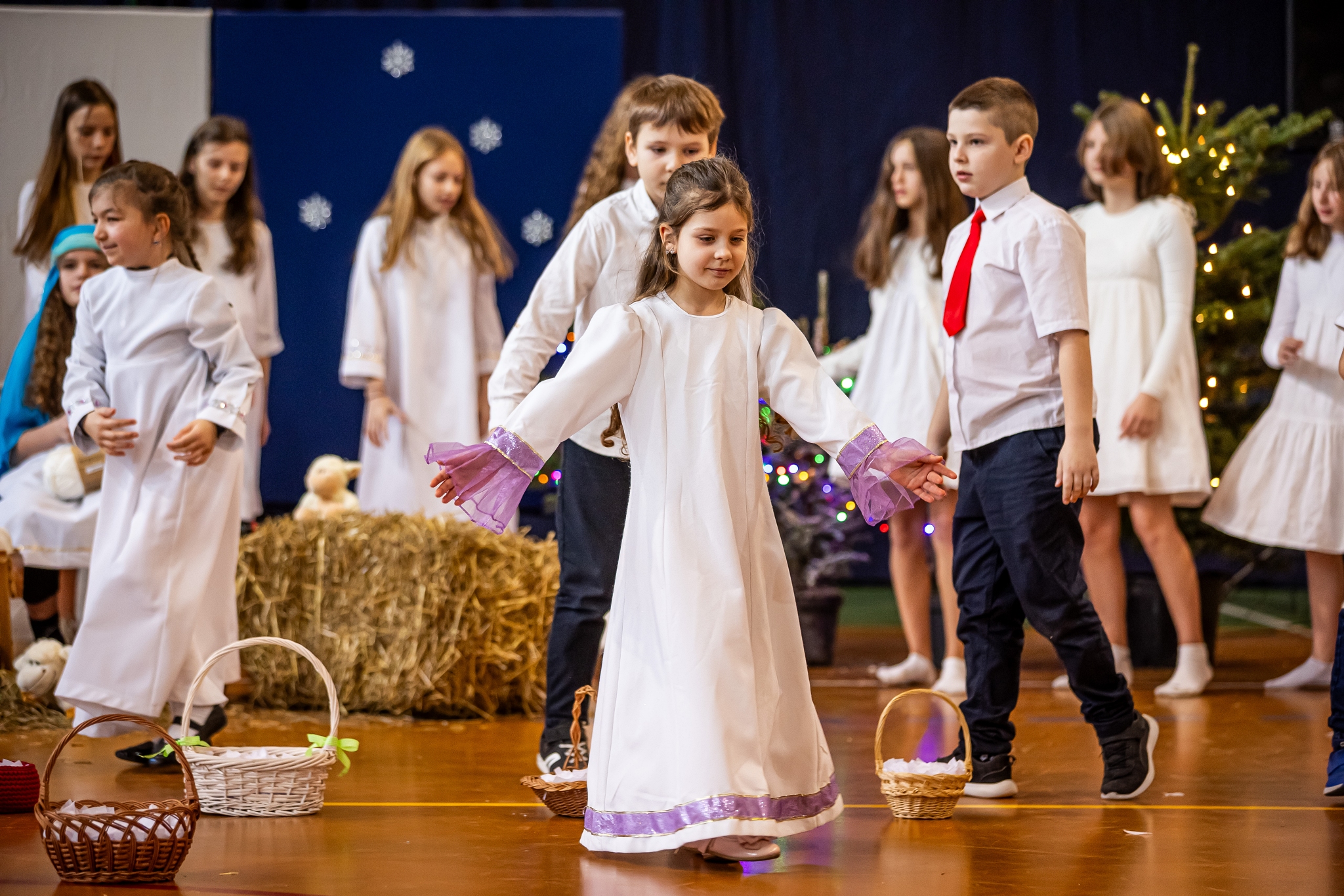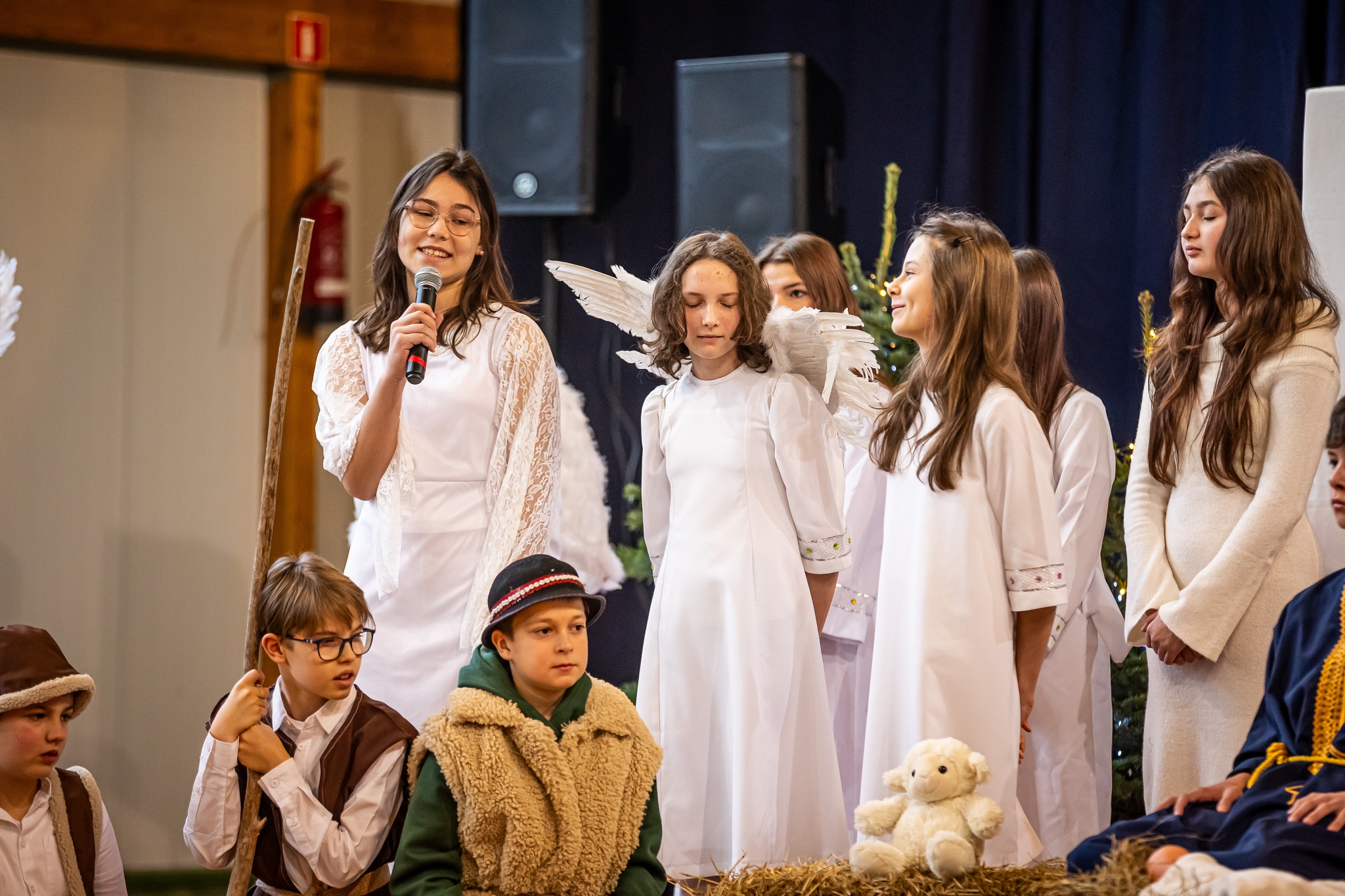 Uroczystość składała się z dwóch części. Pierwszą z nich było tradycyjne przedstawienie w którym uczniowie zaprezentowali biblijne sceny narodzin Jezusa. Młodzi aktorzy z dużym zaangażowaniem i wrażliwością oddali sens i przesłanie świąt, a całość dopełniały piękne dekoracje oraz nastrojowa oprawa muzyczna. Druga część wydarzenia miała charakter wspólnego kolędowania.