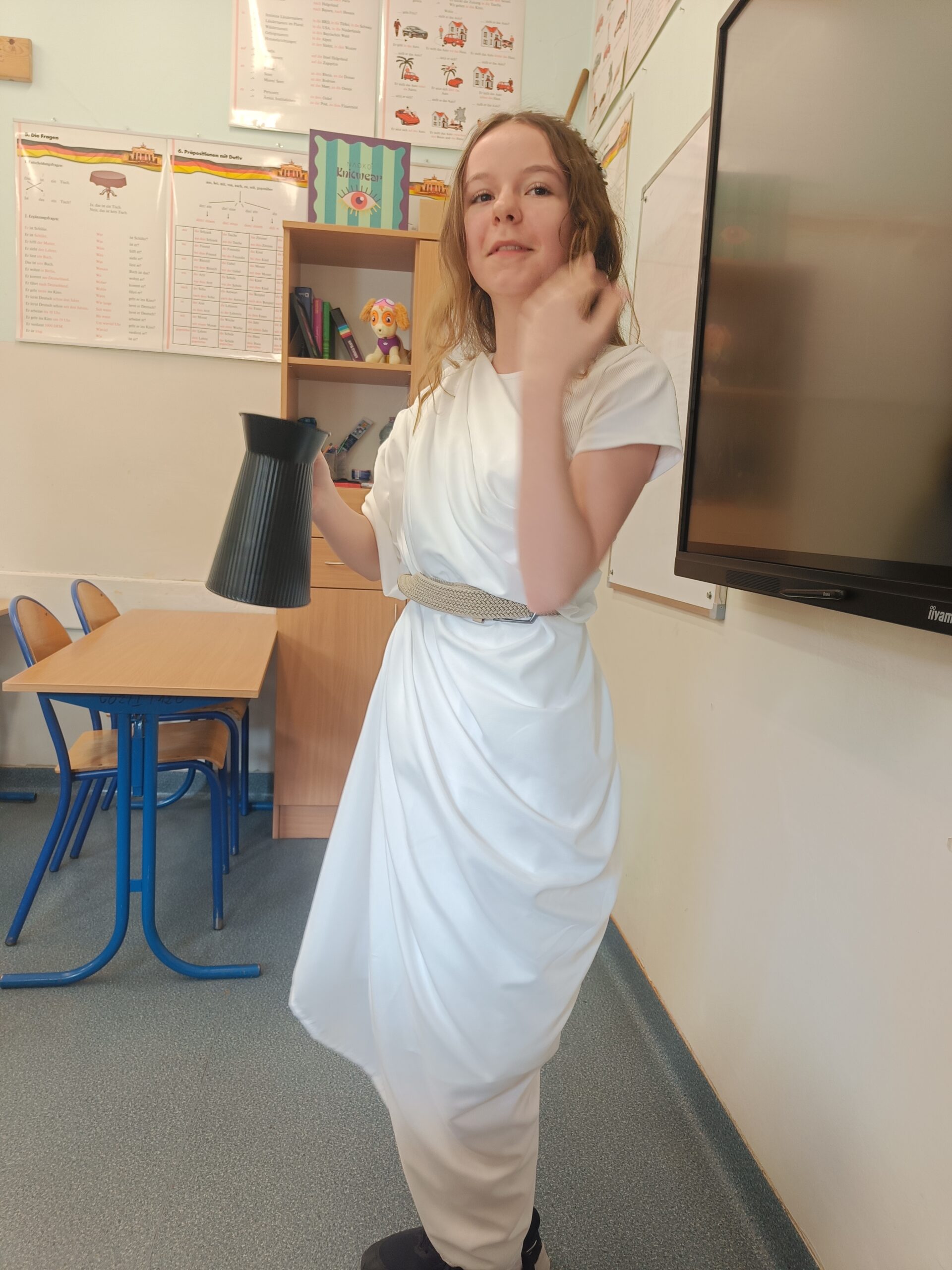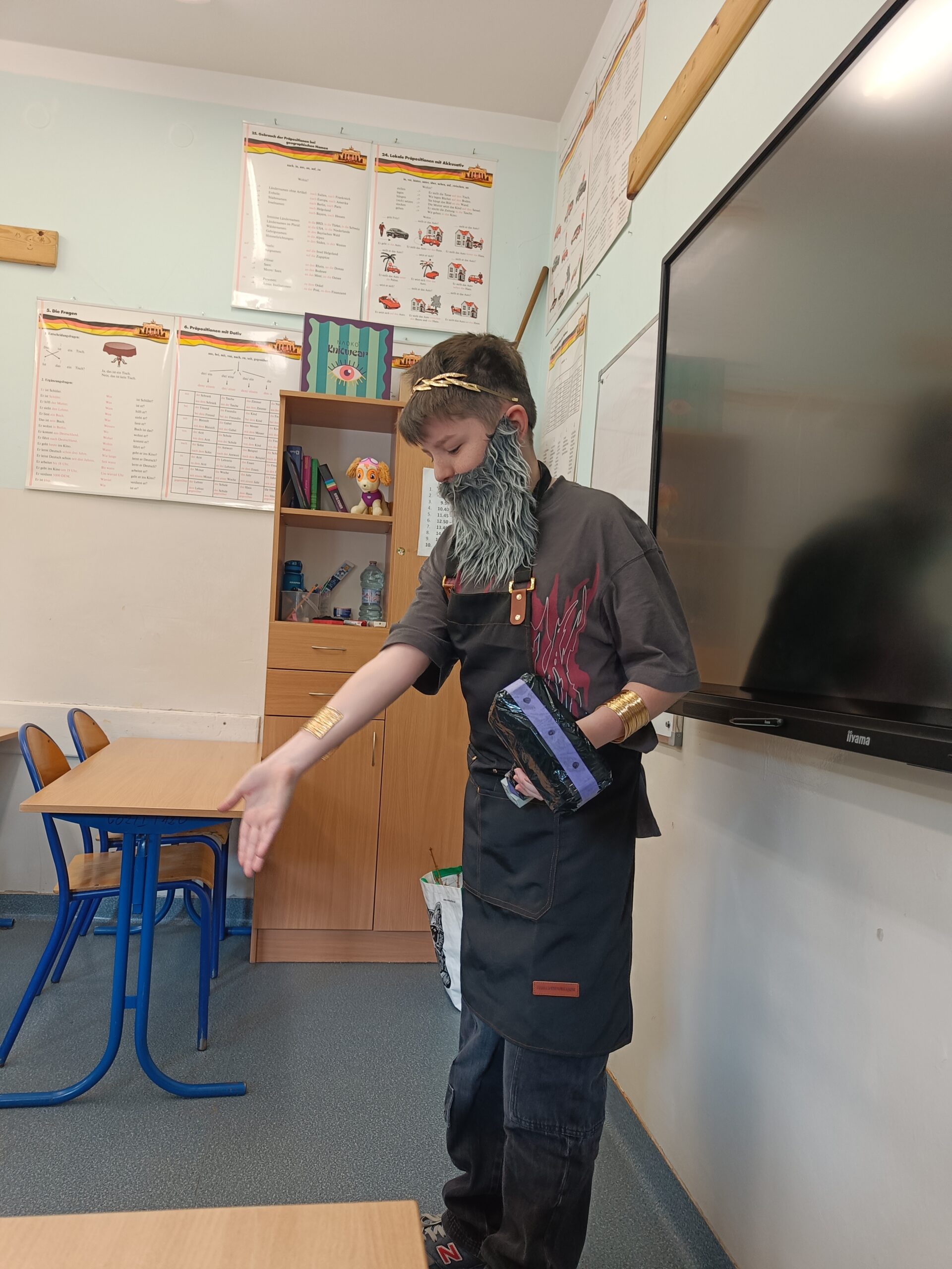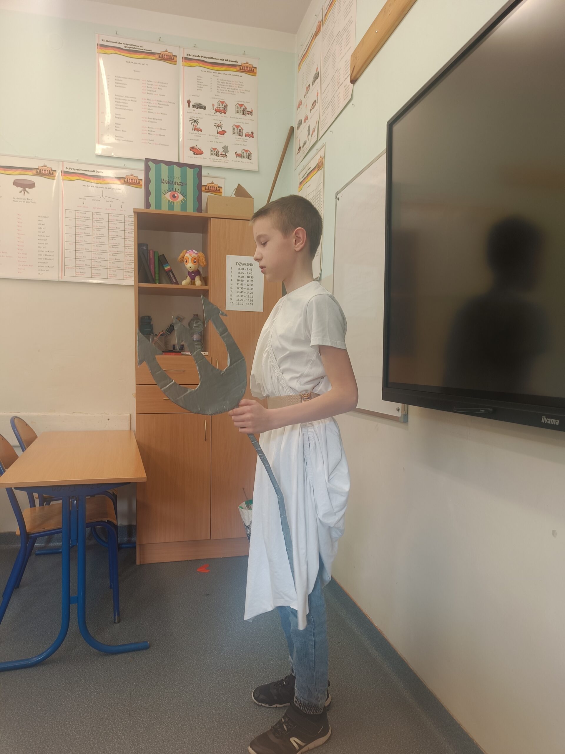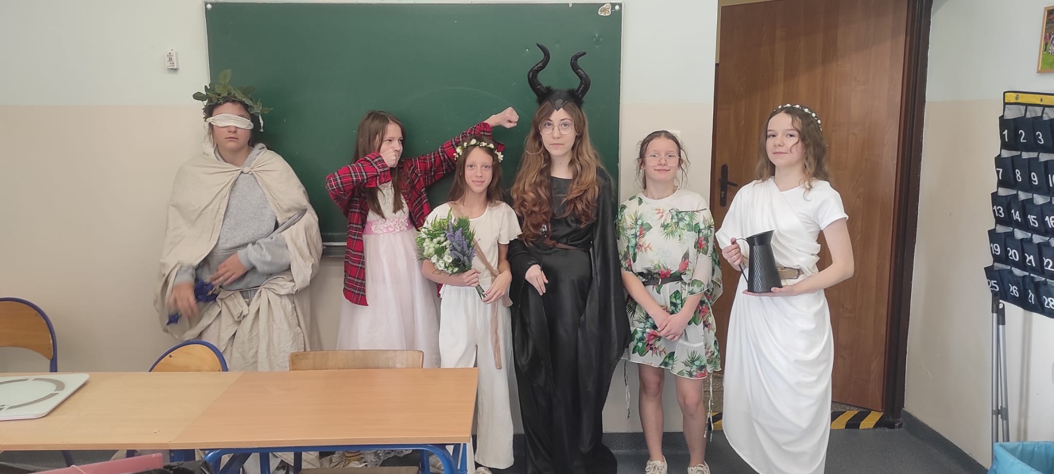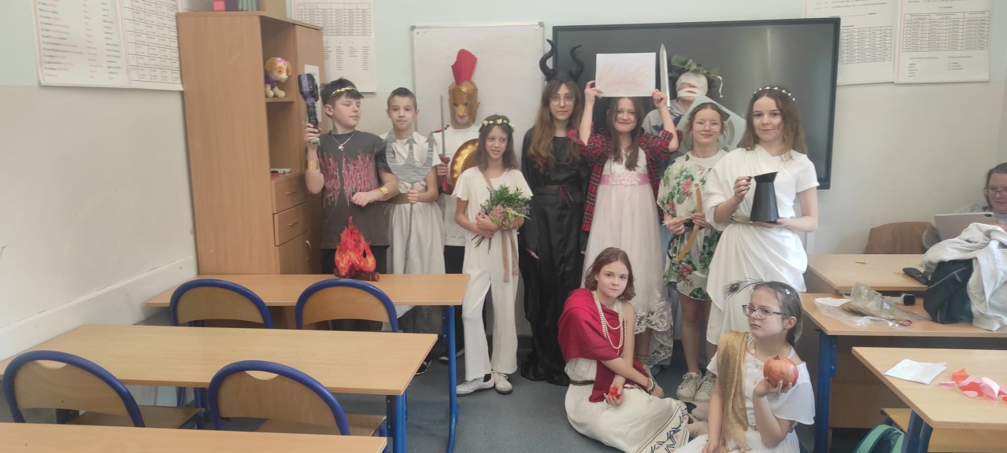 Uczniowie klasy 5c wzięli udział w niezwykłej lekcji języka polskiego poświęconej mitologii greckiej. Tego dnia sala lekcyjna zamieniła się w prawdziwy Olimp – uczniowie wcielili się w role greckich bogów i bogiń, przygotowując stroje oraz charakterystyczne atrybuty swoich postaci.