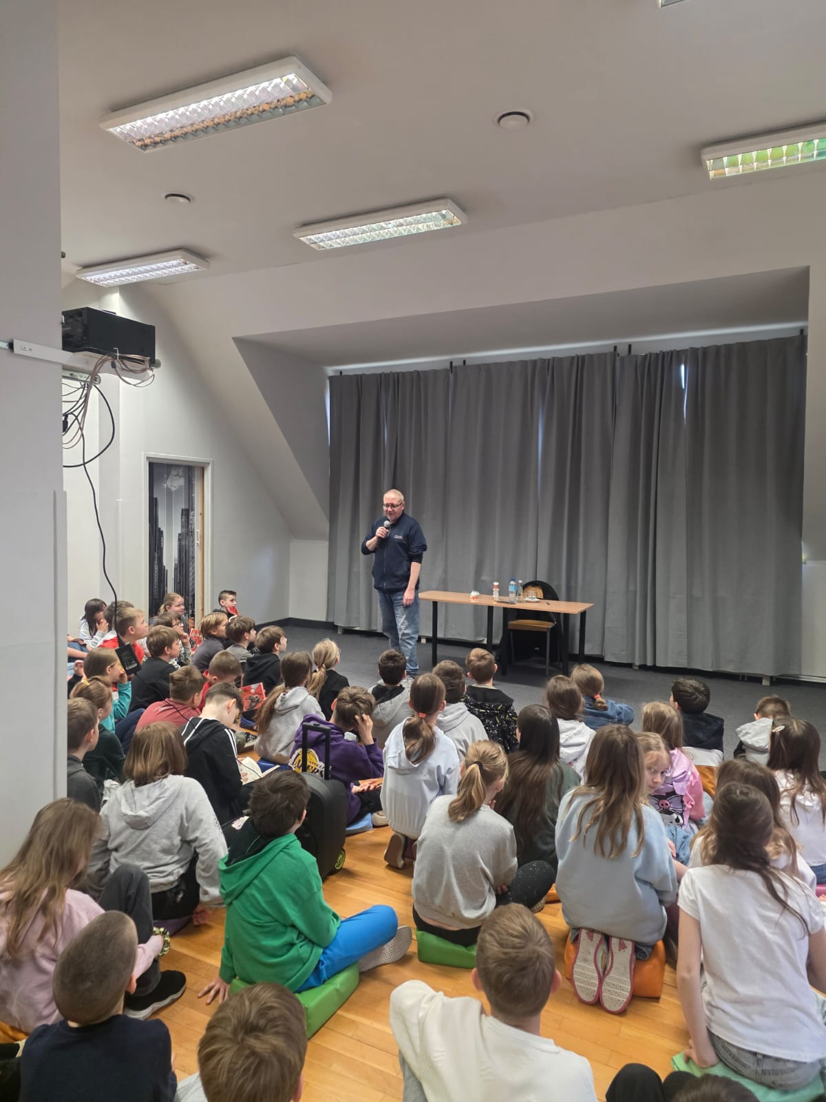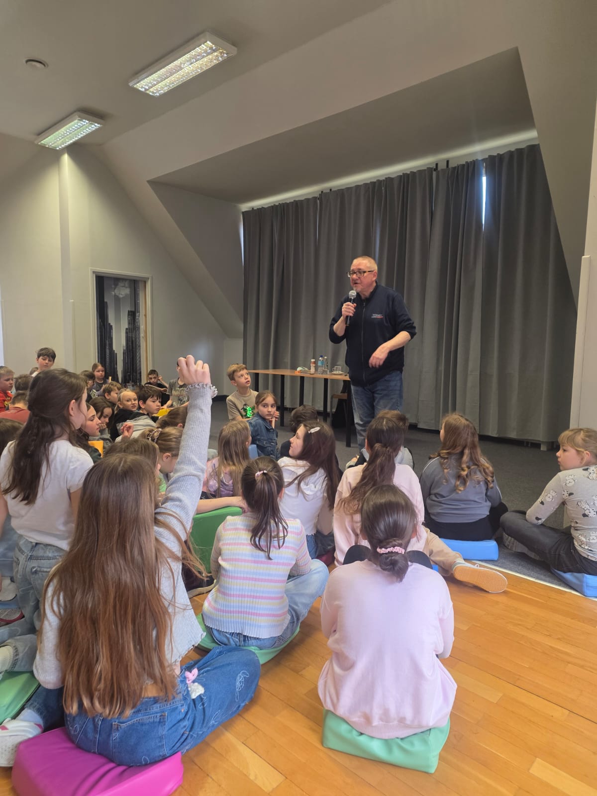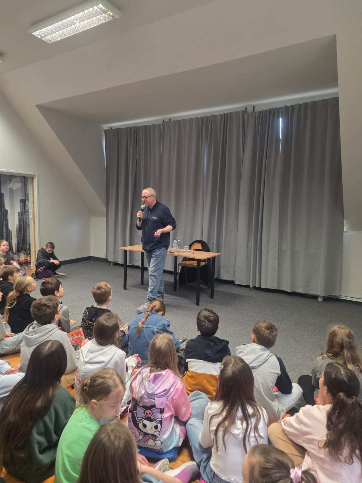 12 marca 2026 roku w naszej szkole odbyło się spotkanie autorskie z Marcinem Pałaszem – popularnym pisarzem książek dla dzieci i młodzieży. Autor w ciekawy i pełen humoru sposób opowiadał o swojej drodze do zostania pisarzem.