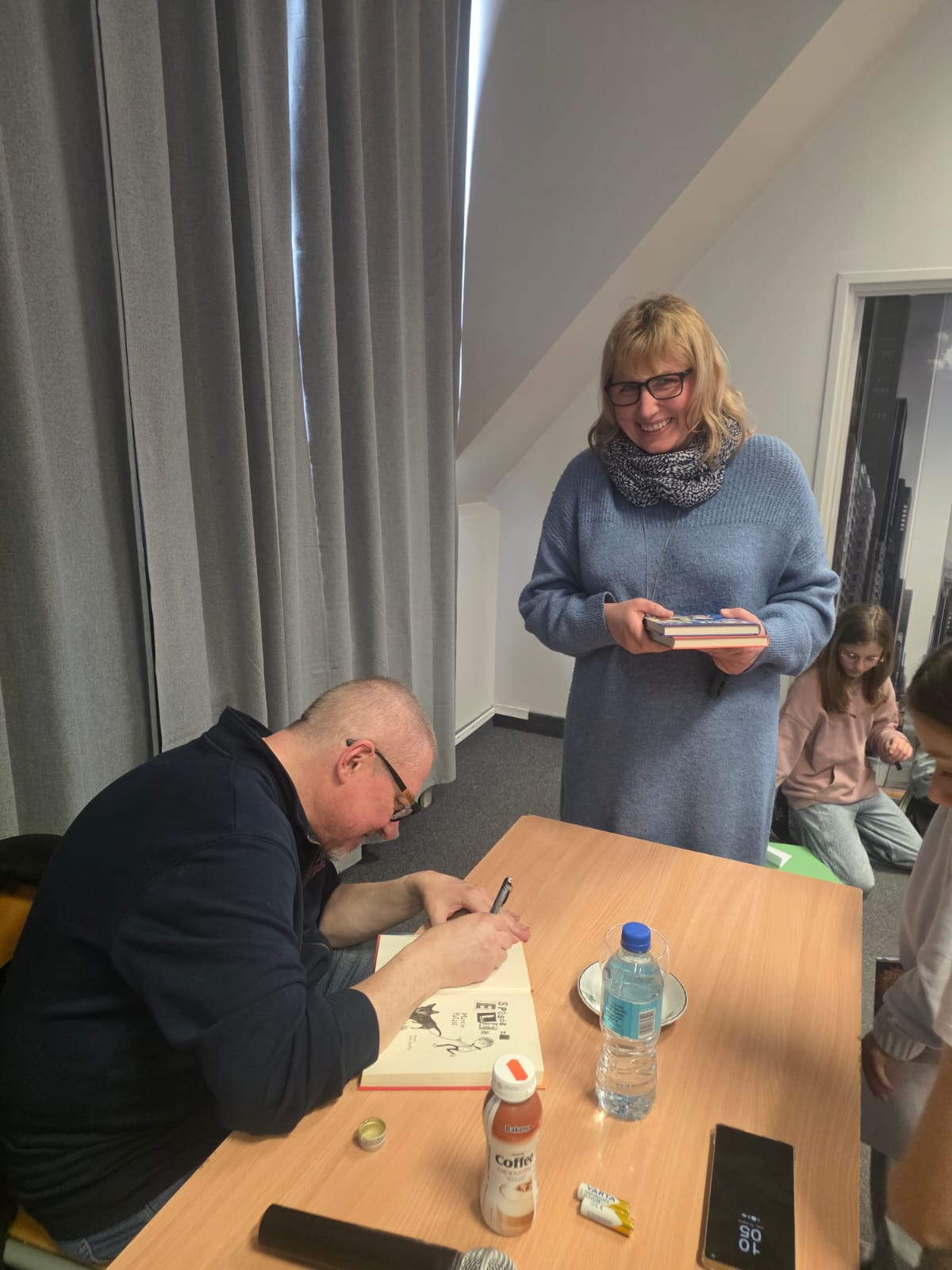 Spotkanie przebiegło w bardzo miłej atmosferze. Uczniowie z zainteresowaniem słuchali, zadawali pytania i zdobywali autografy. Było to inspirujące wydarzenie, które zachęciło wielu uczniów do czytania książek. ![]()