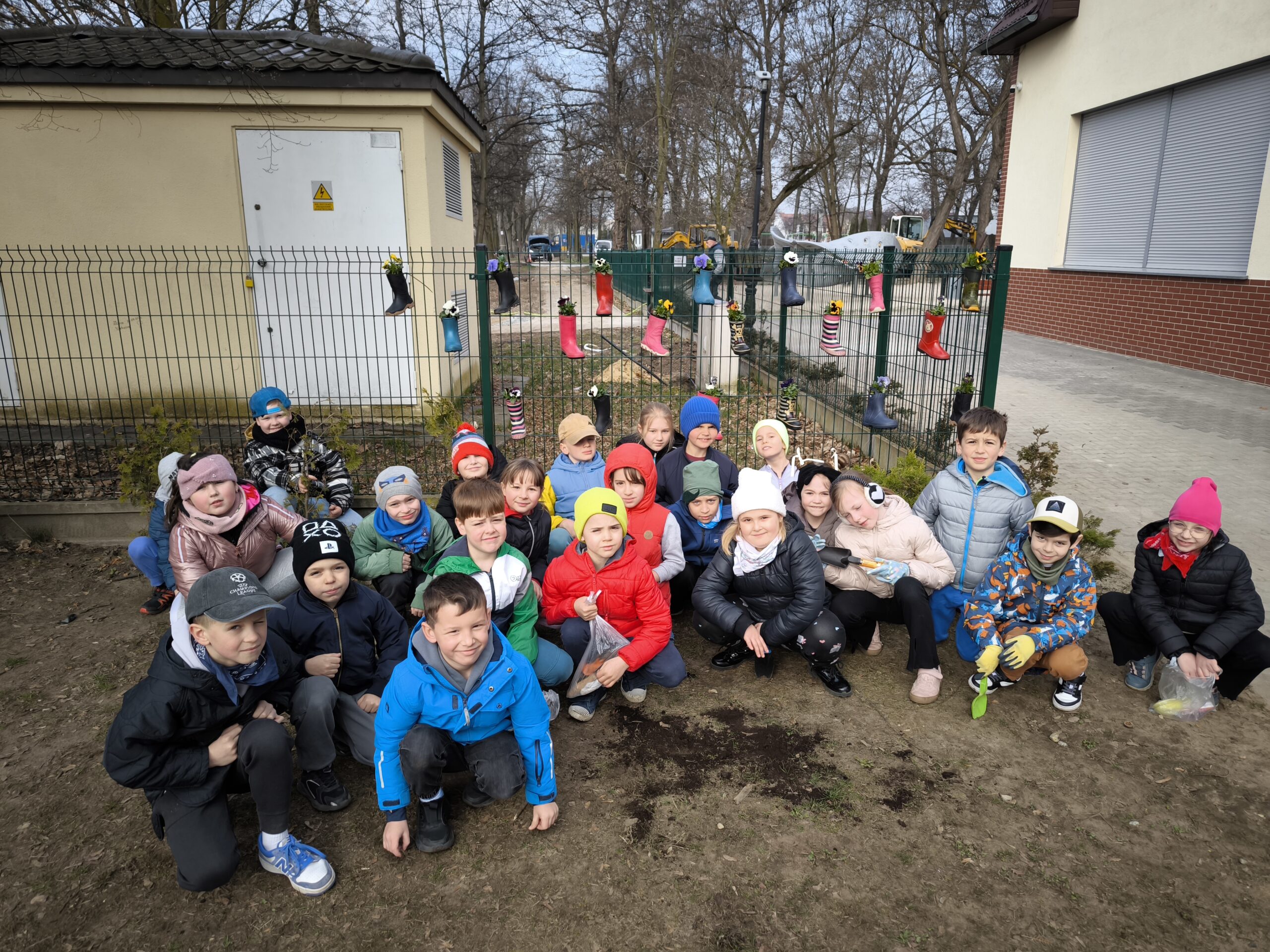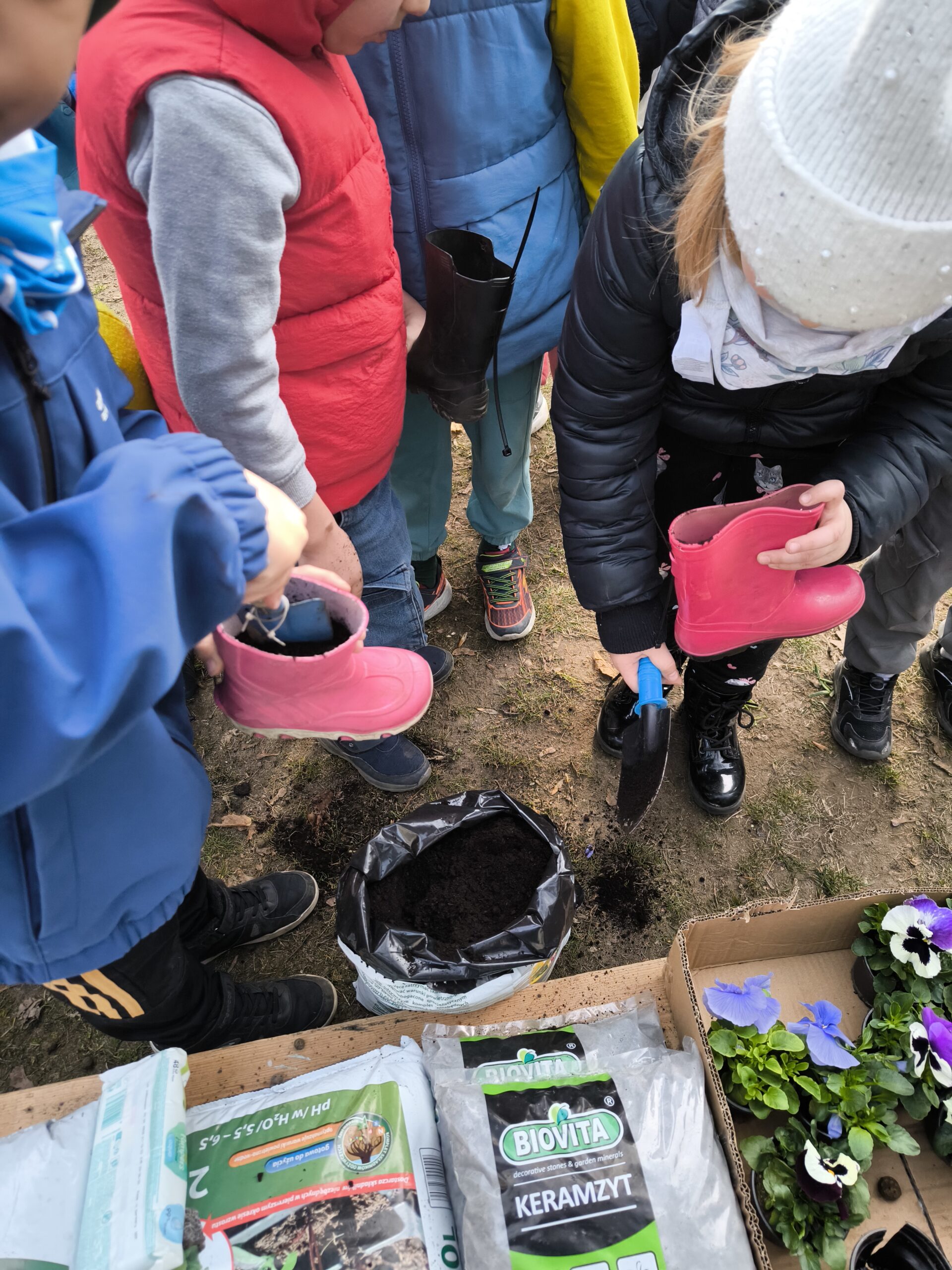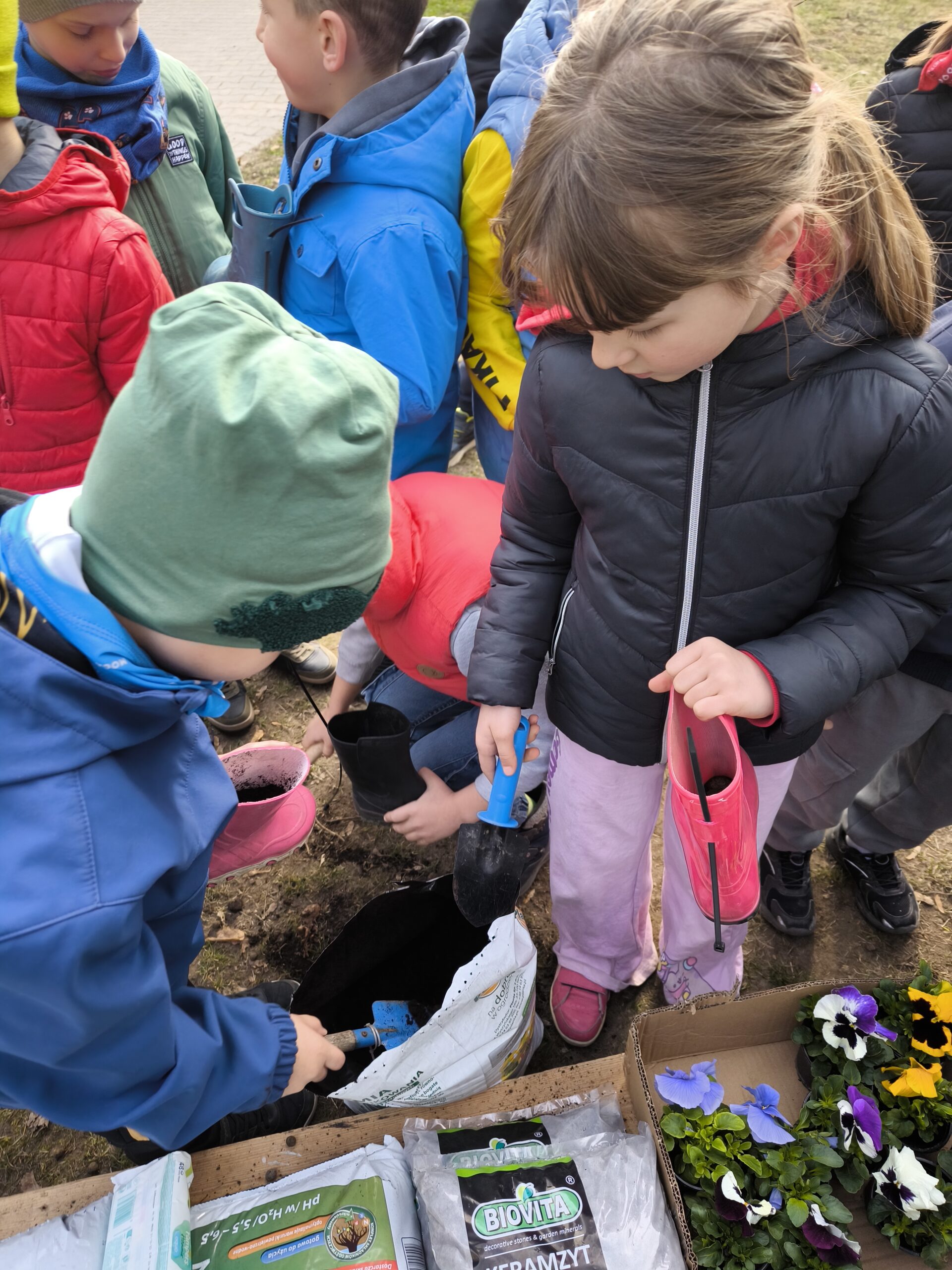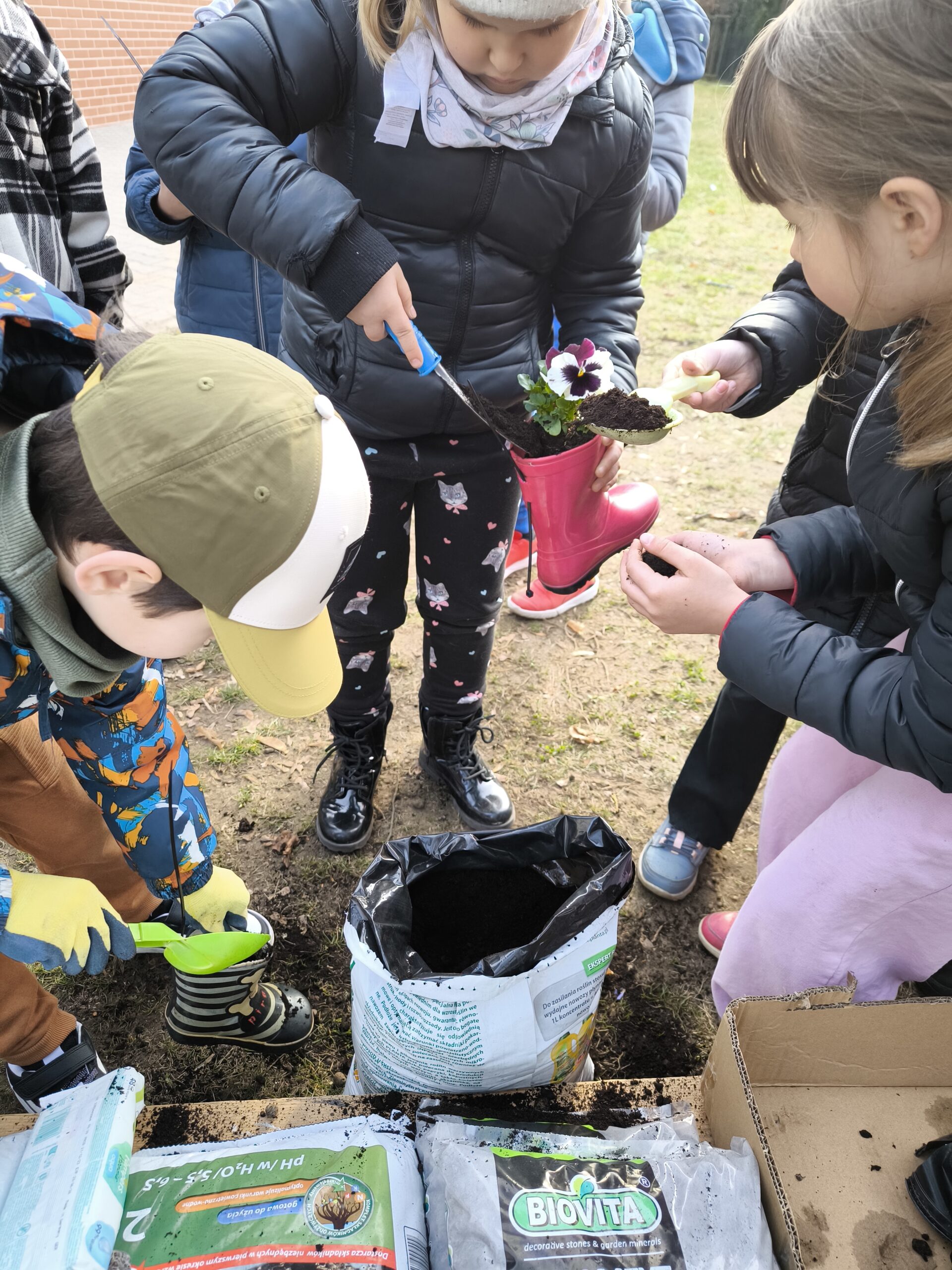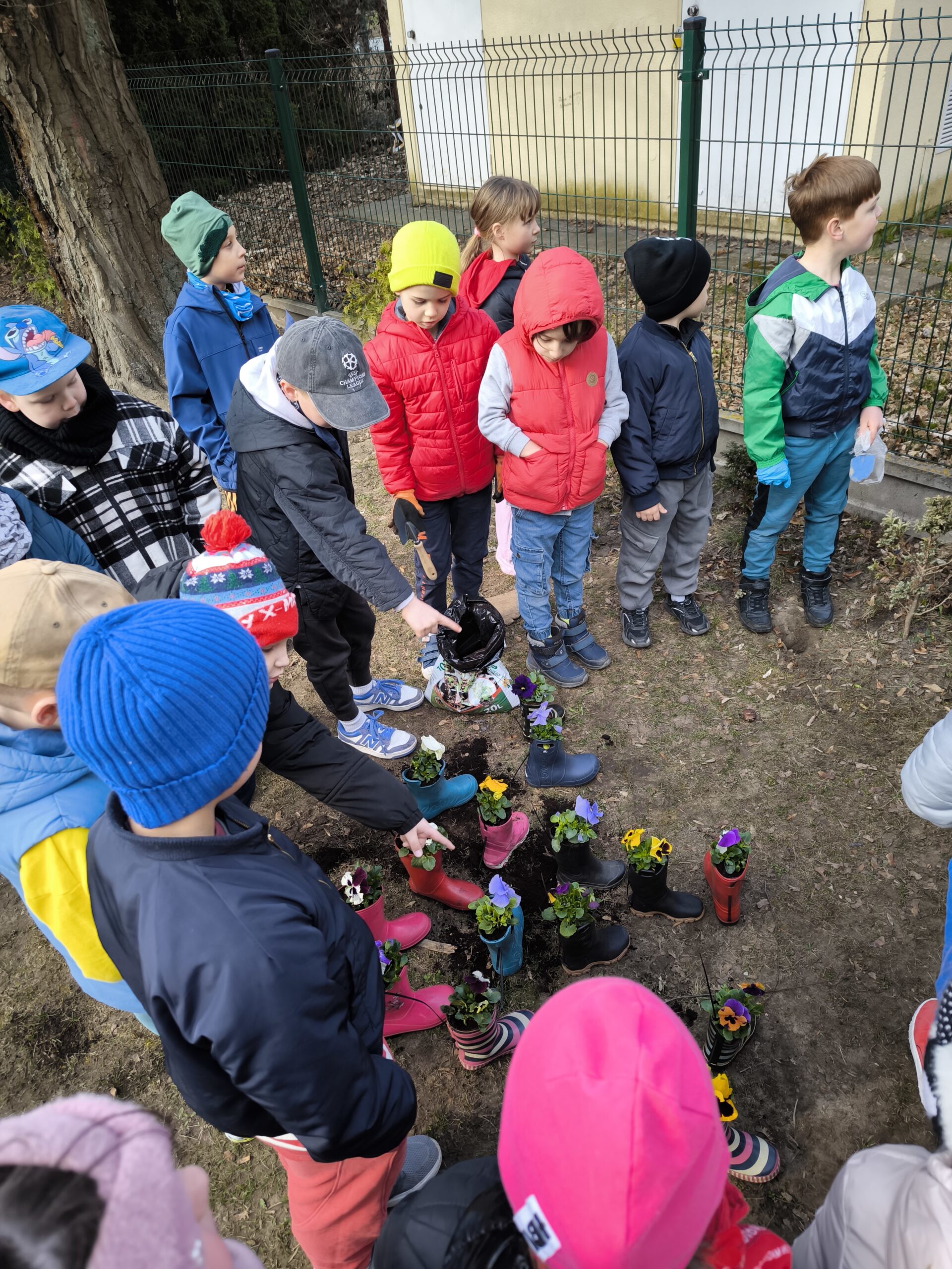 Dziś klasa 1C z radością przywitała wiosnę! A w jaki sposób? W bardzo pomysłowy i nietypowy — uczniowie zasadzili kolorowe bratki w… kaloszkach! 🌼👢