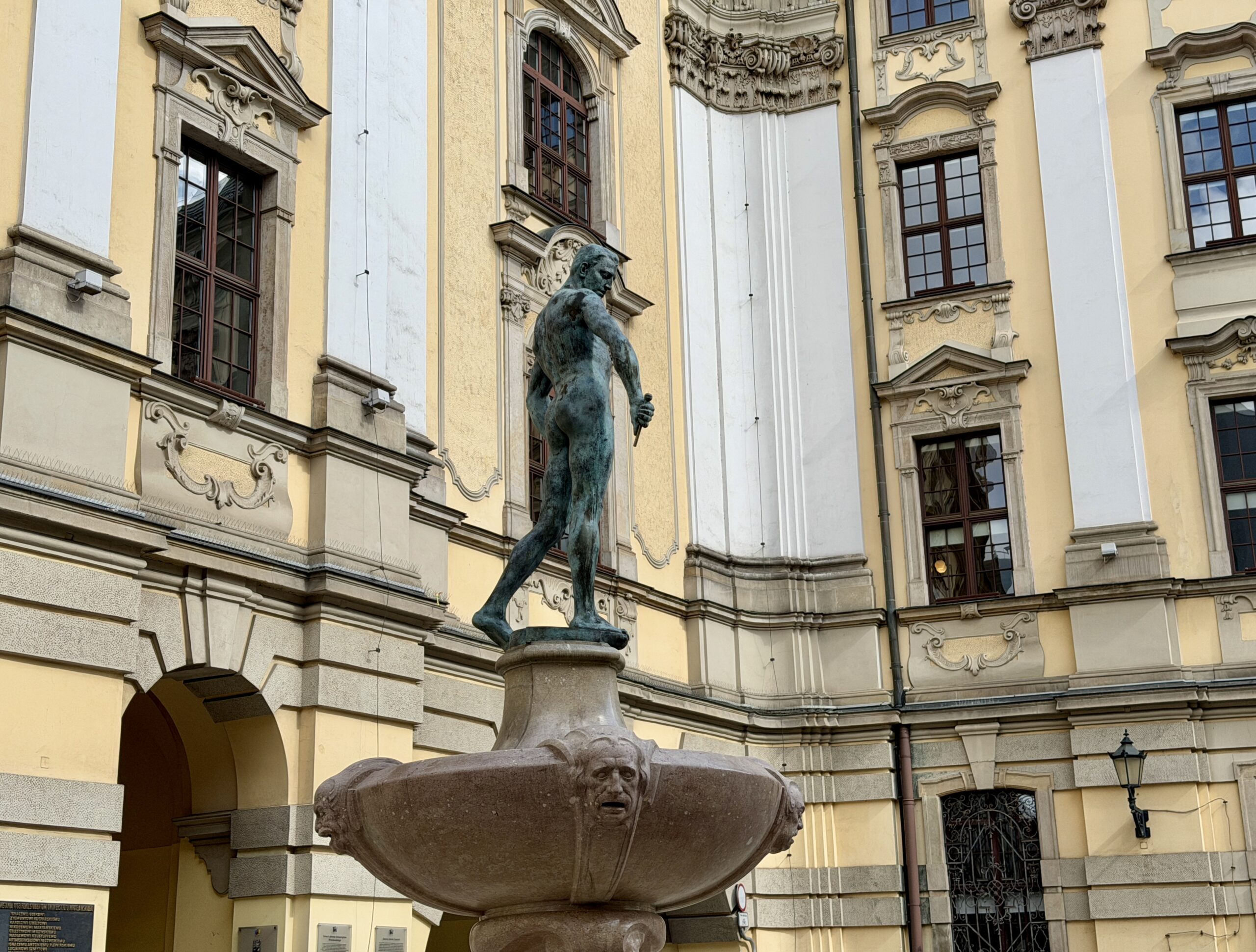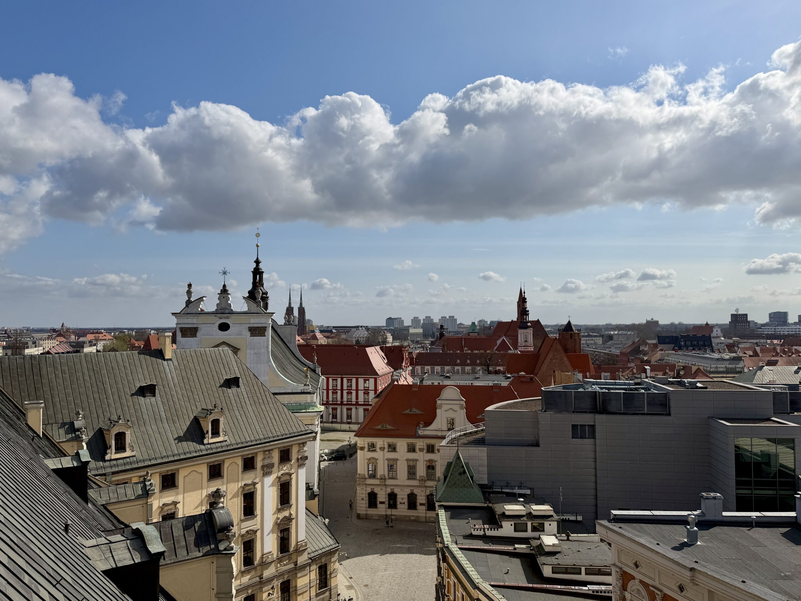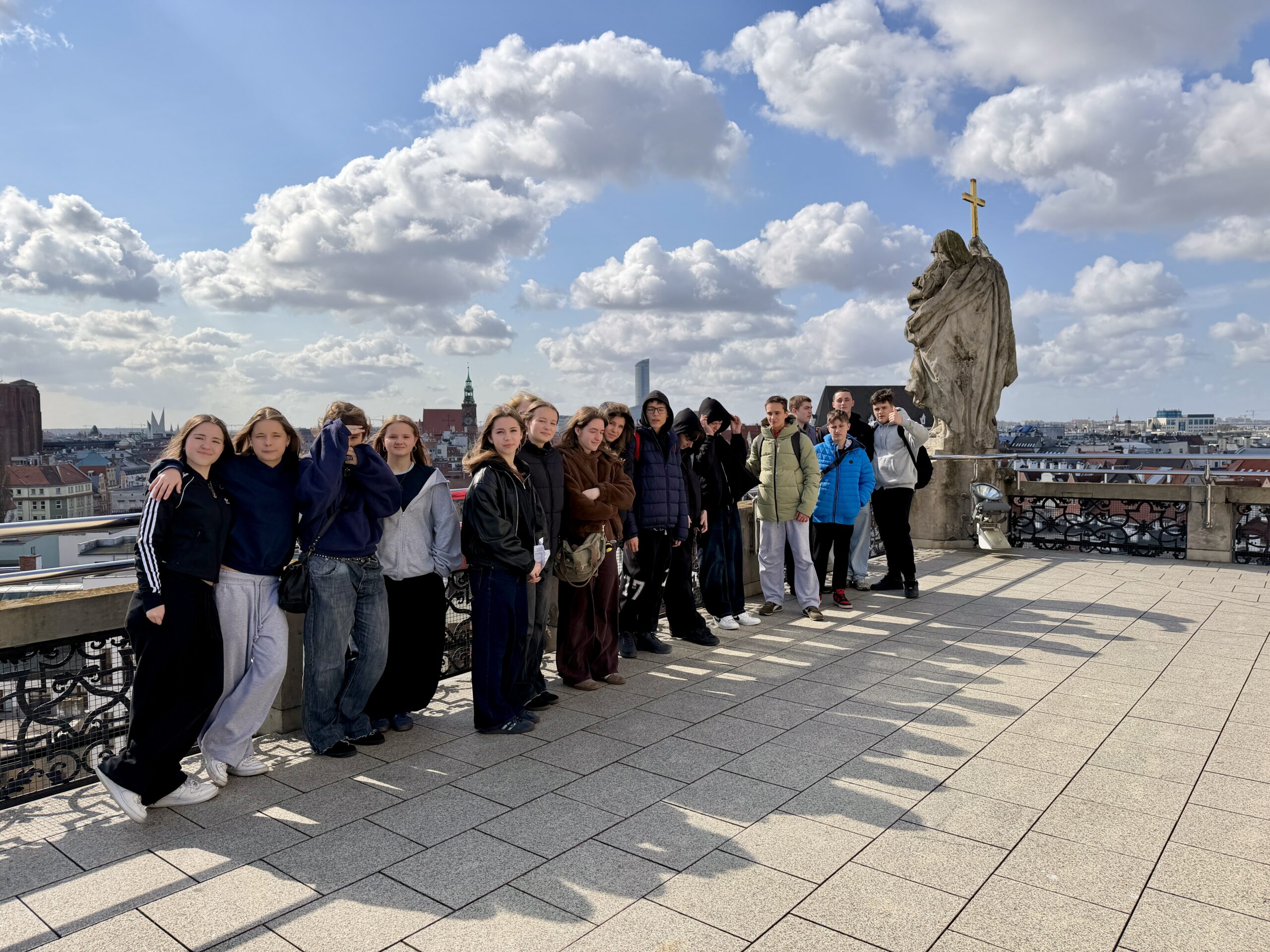 Kolejnym etapem wycieczki było zwiedzanie gmachu głównego Uniwersytetu Wrocławskiego. Uczniowie mieli okazję podziwiać barokową Aulę Leopoldinum, jedną z najpiękniejszych sal reprezentacyjnych w Polsce. Następnie weszli na Wieżę Matematyczną, skąd mogli podziwiać panoramę Wrocławia.