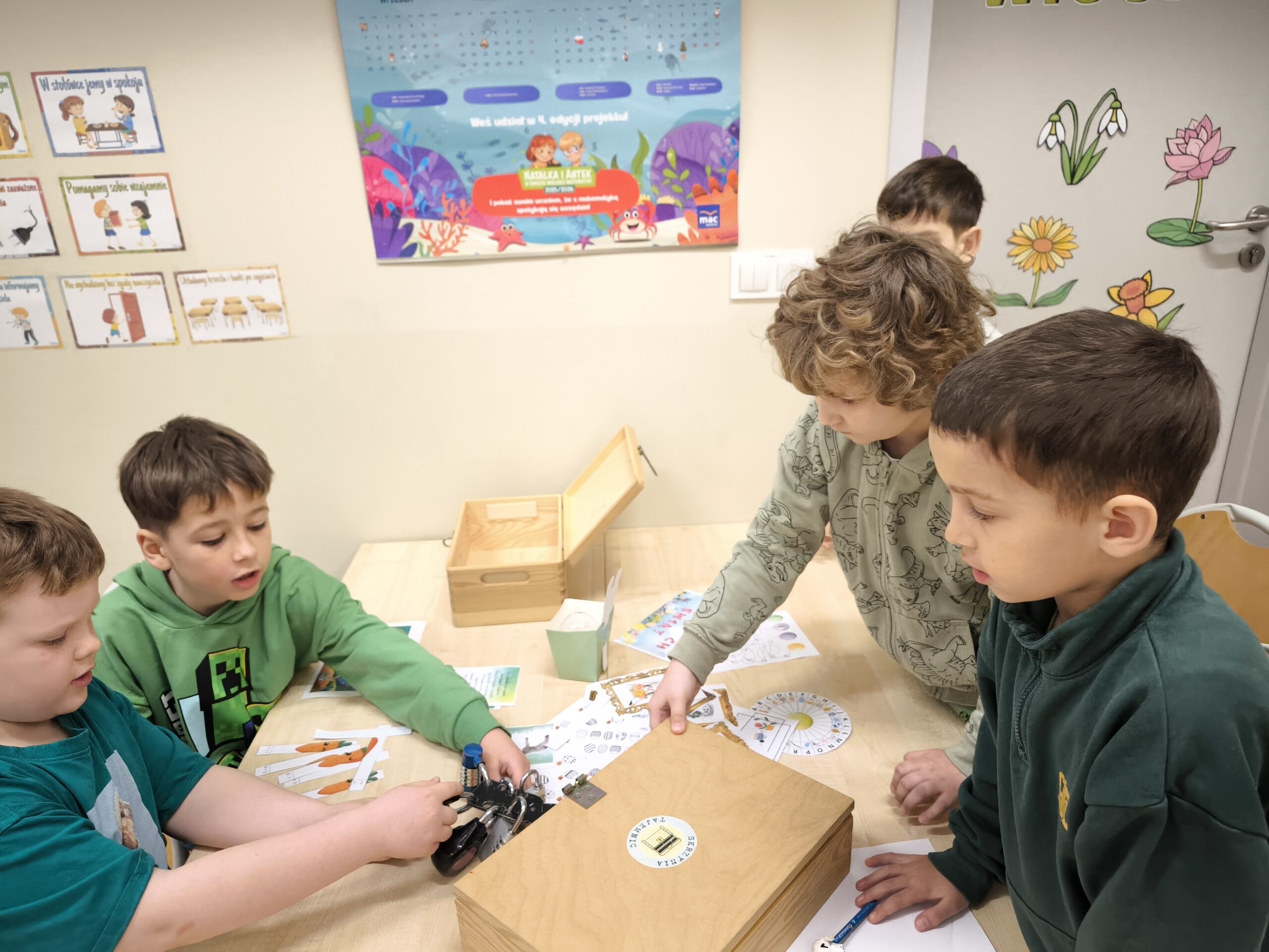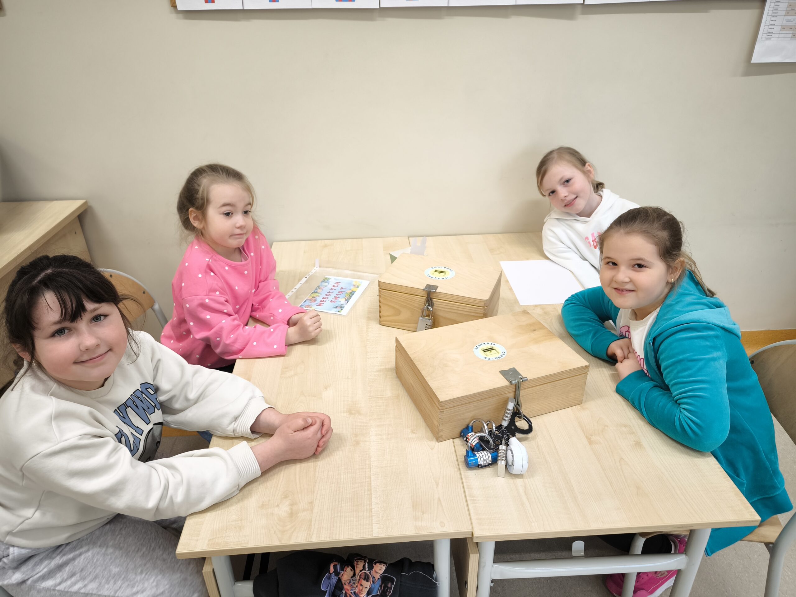 Każda grupa otrzymała dwie skrzynki zabezpieczone aż ośmioma kłódkami, a w środku… kolejne zagadki i kolejne skrzynki do otwarcia. Uczniowie z zapałem rozwiązywali logiczno-matematyczne łamigłówki, szukali wskazówek i wspólnie ustalali kolejne kroki.