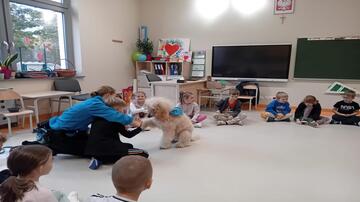 W naszej szkole rozpoczął się cykl spotkań dogoterapii. Abi, bo tak wabi się pies jest cudownym zwierzęciem. Nawet dzieci, które panicznie bały się psów brały aktywnie udział w zajęciach. Iwona Wierzbicka
